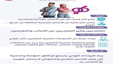 وأشار إلى أن المبادرة تستهدف المقبلين على الزواج من المصريين والمقيمين على أرض مصر، لإجراء الفحص الطبي واستخراج الشهادة الصحية، وقال إنها تشمل حزمة من الفحوصات الطبية للمقبلين على الزواج، للكشف المبكر عن العديد من الأمراض المعدية وغير السارية، للتأكد من خلوهم من الأمراض التي قد تؤثر عليهما في المستقبل، أو احتمالية انتقال الأمراض بينهما.