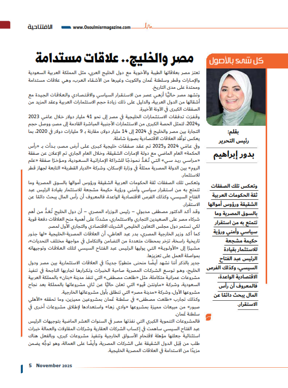 مصر والخليج.. علاقات مستدامة بقلم بدور إبراهيم - رئيس تحرير مجلة أصول مصر