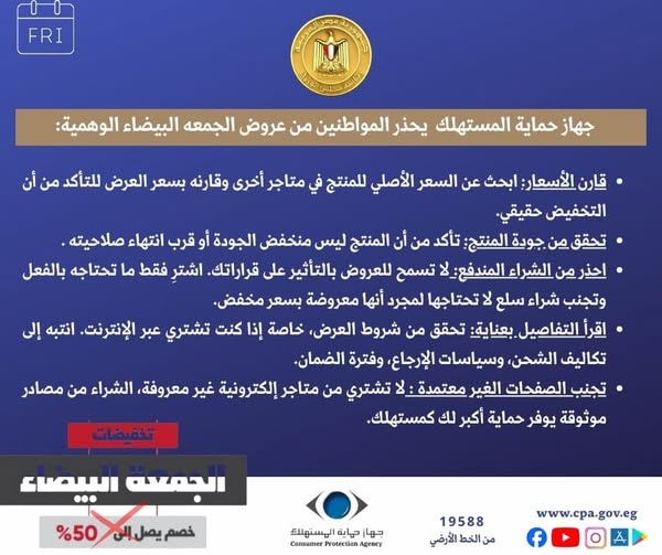 جهاز حماية المستهلك يحذر المواطنين من عروض الجمعة البيضاء الوهمية