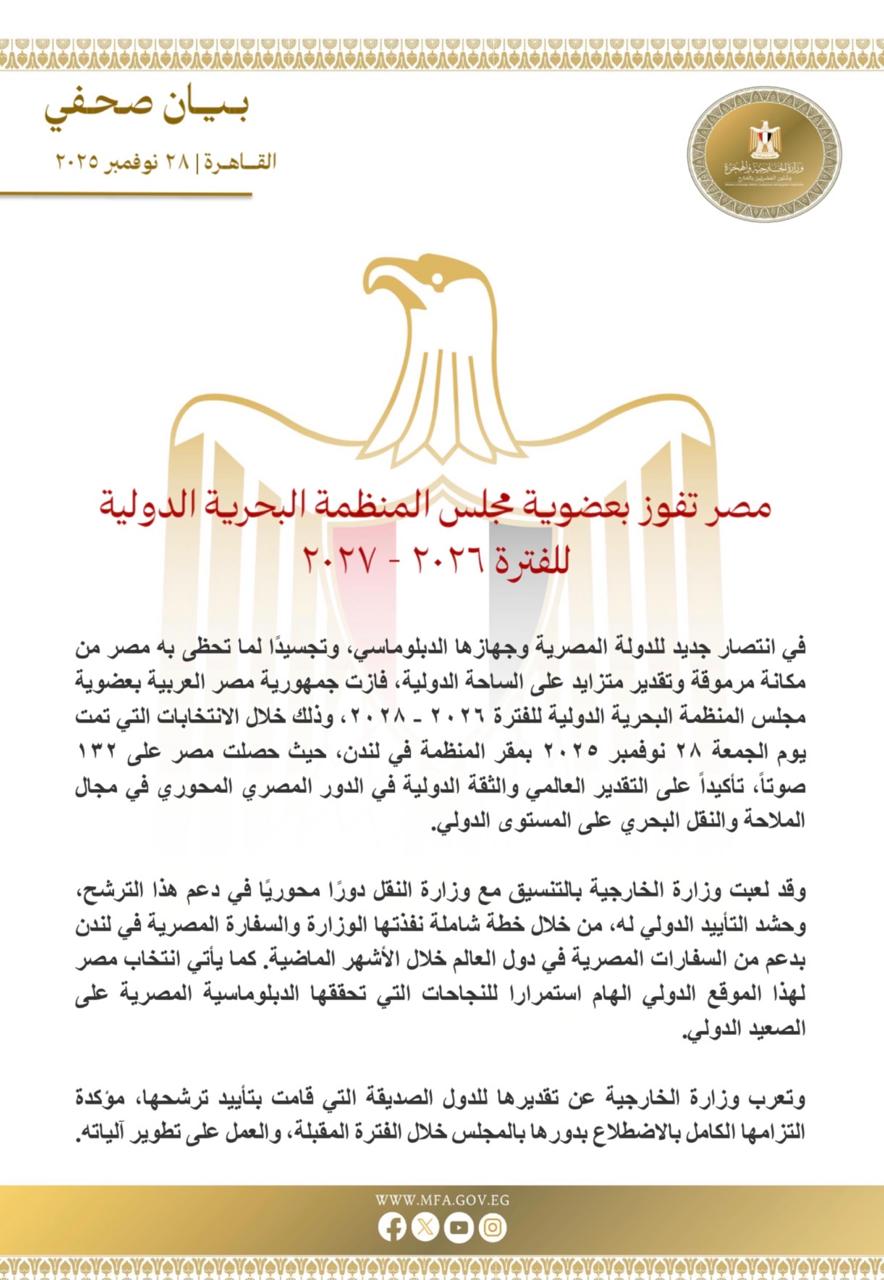 في انتصار جديد للدولة المصرية وجهازها الدبلوماسي، وتجسيدًا لما تحظى به مصر من مكانة مرموقة وتقدير متزايد على الساحة الدولية، فازت جمهورية مصر العربية بعضوية مجلس المنظمة البحرية الدولية للفترة 2026 - 2028، وذلك خلال الانتخابات التي تمت اليوم الجمعة بمقر المنظمة فى لندن، حيث حصلت مصر على 132 صوتاً، تأكيداً على التقدير العالمي والثقة الدولية في الدور المصري المحوري في مجال الملاحة والنقل البحري على المستوى الدولي.