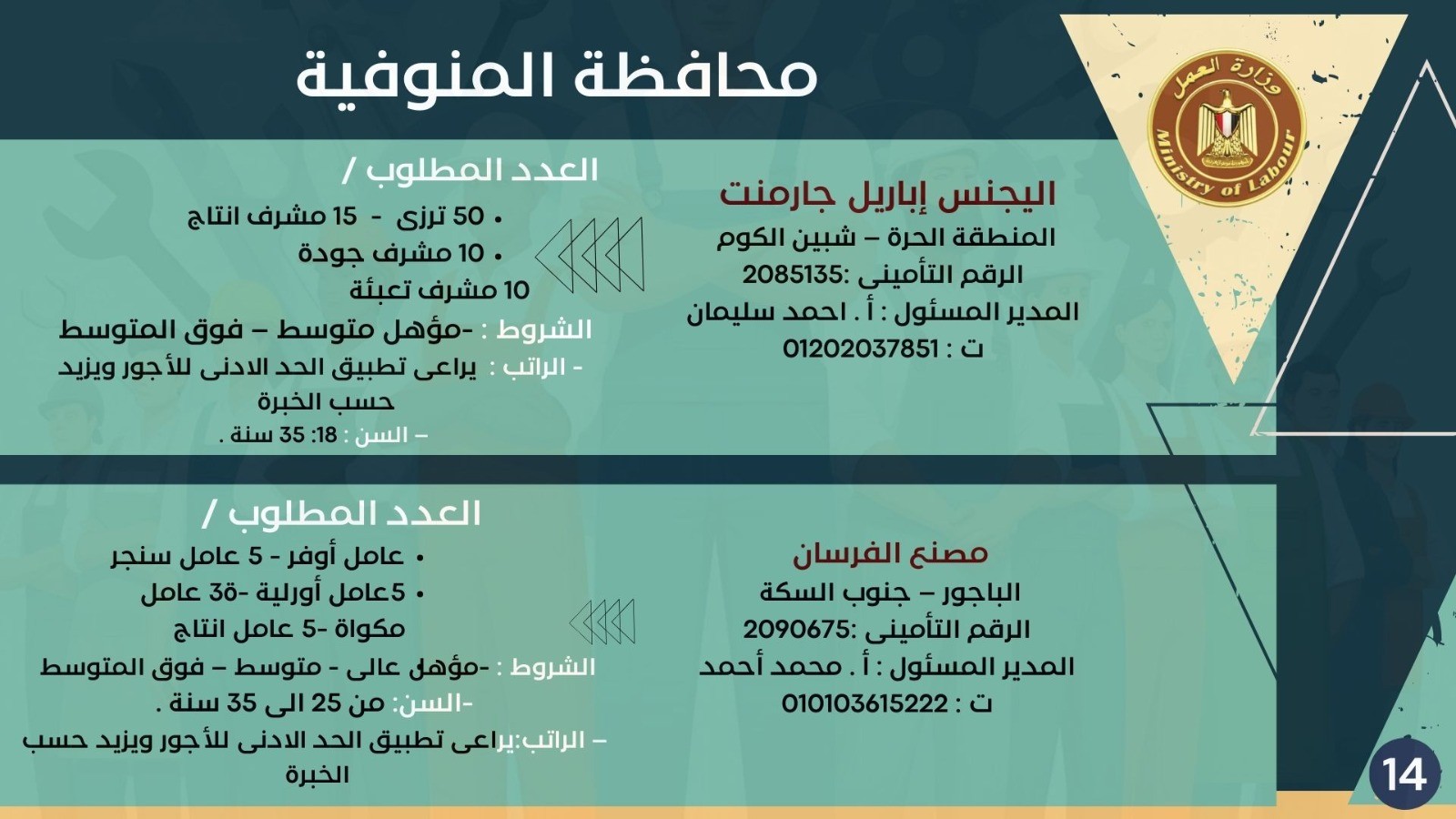 وأوضحت الوزارة في بيانها أن 31 شركة من القطاع الخاص في 10 محافظات أبدت استعدادها لتوفير 5843 فرصة عمل جديدة في عدد من التخصصات والمهن المختلفة، من بينها فرص مخصصة لأصحاب القدرات الخاصة (ذوي الهمم)، برواتب مجزية تُحدد وفقًا لطبيعة المقابلة الشخصية، مع الالتزام الكامل بتطبيق الحد الأدنى للأجور، فضلًا عن الاستفادة من منظومة التأمين الصحي والاجتماعي. وتشمل النشرة الحالية فرصًا متاحة في محافظات: القاهرة، الجيزة، المنوفية، السويس، القليوبية، الإسماعيلية، الوادي الجديد، المنيا، أسيوط، وقنا.