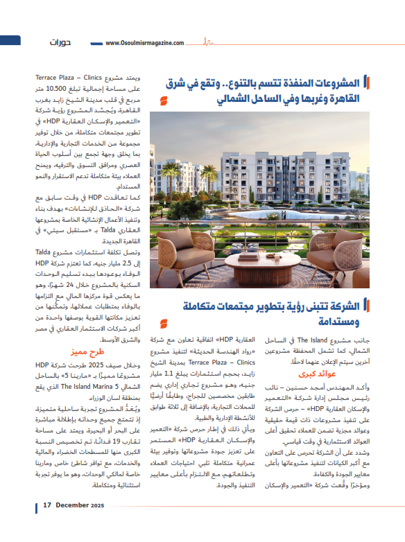 ويأتي ذلك في إطار حرص شركة «التعمير والإسكان العقارية HDP» المستمر على تعزيز جودة مشروعاتها وتوفير بيئة عمرانية متكاملة تلبي احتياجات العملاء وتطلعاتهم، مع الالتزام بأعلى معايير التنفيذ والجودة.