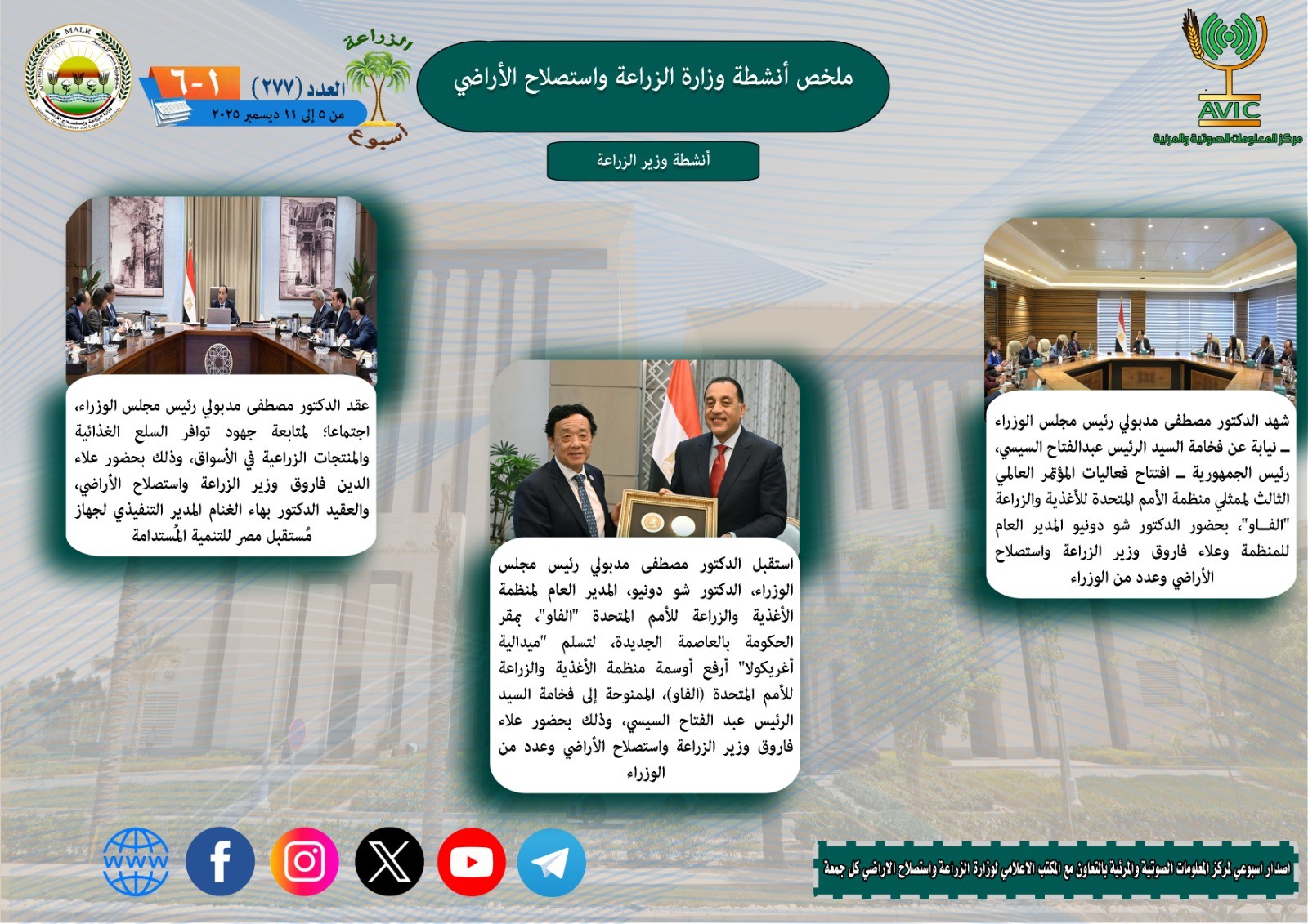 يذكر ان مركز المعلومات الصوتية والمرئية، والمكتب الاعلامي للوزارة، يصدران الجمعة من كل اسبوع، انفوجرافا وفيديو باسم: الزراعة في اسبوع، لالقاء الضوء على ملخص ما تم من انشطة وجهود، بكافة القطاعات والهيئات، التابعة للوزارة، فضلا عن انفوجراف وفيديو كل ثلاثاء باسم: الزراعة في كل مصر، حول انشطة وجهود القطاع الزراعي، بالمحافظات المختلفة.