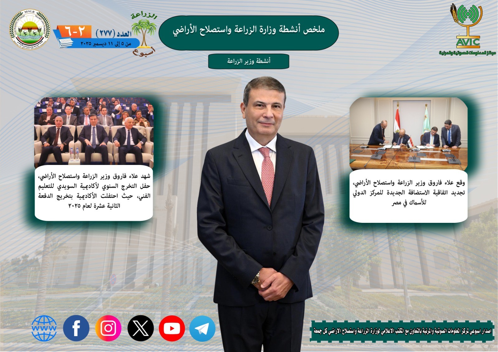 بينما وقع علاء فاروق وزير الزراعة واستصلاح الأراضي، تجديد اتفاقية الاستضافة الجديدة للمركز الدولي للأسماك في مصر، كما شهد الوزير حفل التخرج السنوي لأكاديمية السويدي للتعليم الفني، حيث احتفلت الأكاديمية بتخريج الدفعة الثانية عشرة لعام 2025.
