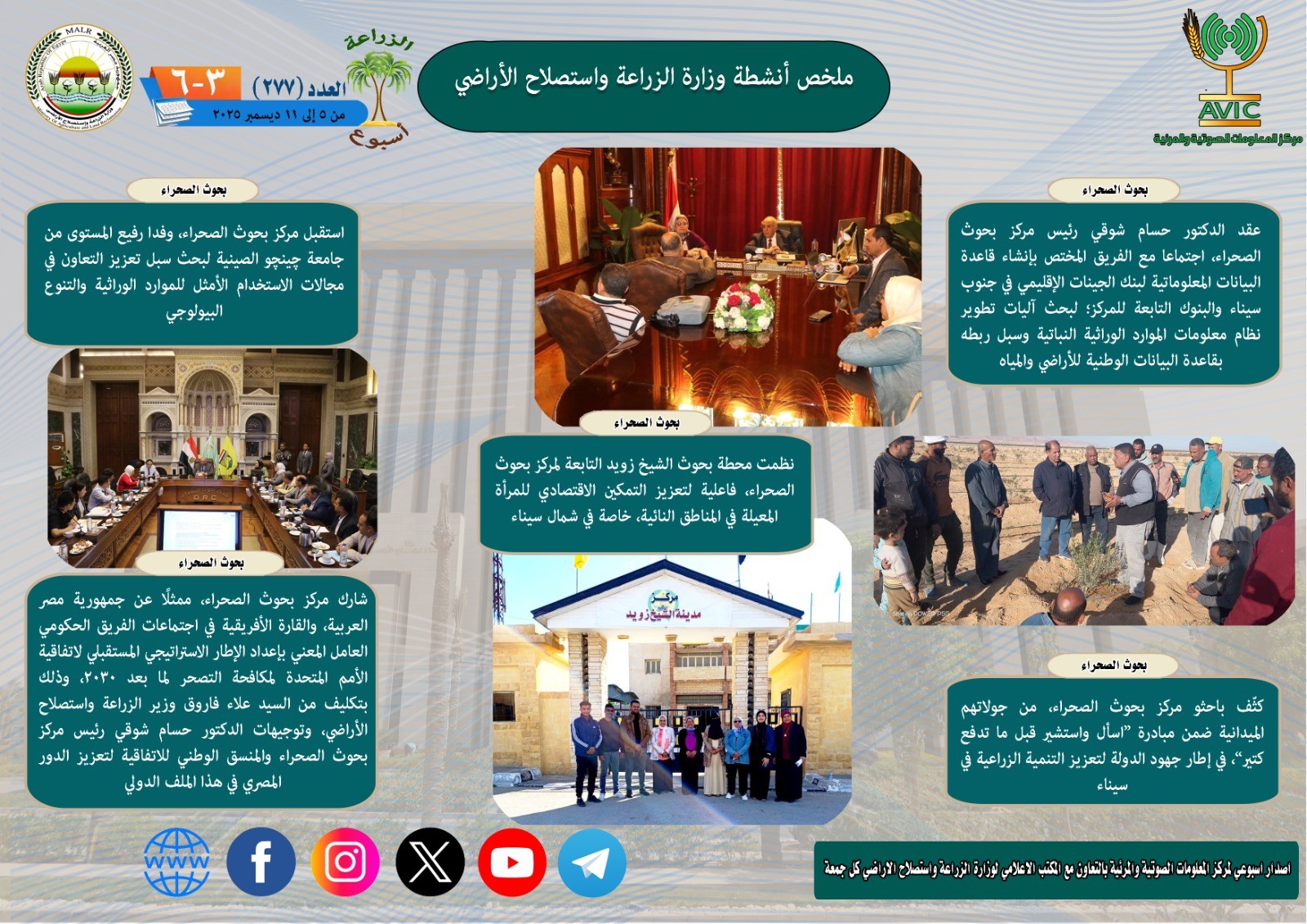 كما كثّف باحثو المركز، جولاتهم الميدانية ضمن مبادرة “اسأل واستشير قبل ما تدفع كتير”، في إطار جهود الدولة لتعزيز التنمية الزراعية في سيناء، كذلك شارك المركز، ممثلًا عن جمهورية مصر العربية، والقارة الأفريقية في اجتماعات الفريق الحكومي العامل المعني بإعداد الإطار الاستراتيجي المستقبلي لاتفاقية الأمم المتحدة لمكافحة التصحر لما بعد 2030، وذلك بتكليف من السيد علاء فاروق وزير الزراعة واستصلاح الأراضي، وتوجيهات الدكتور حسام شوقي رئيس مركز بحوث الصحراء والمنسق الوطني للاتفاقية لتعزيز الدور المصري في هذا الملف الدولي.