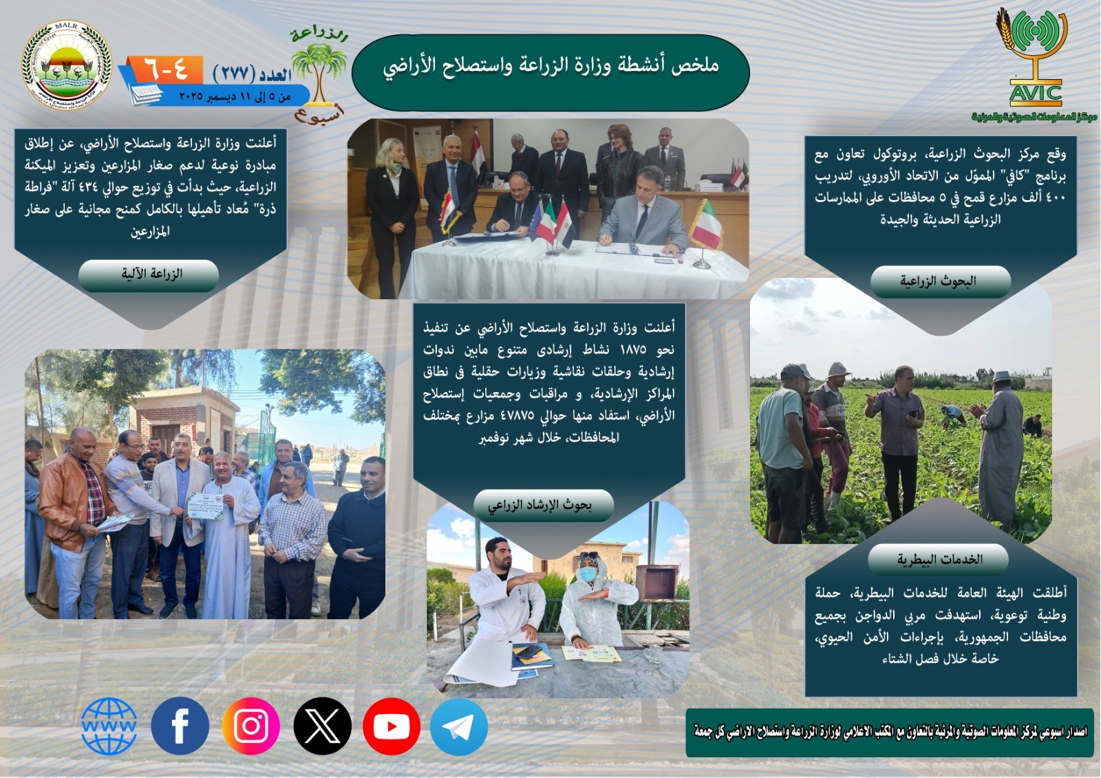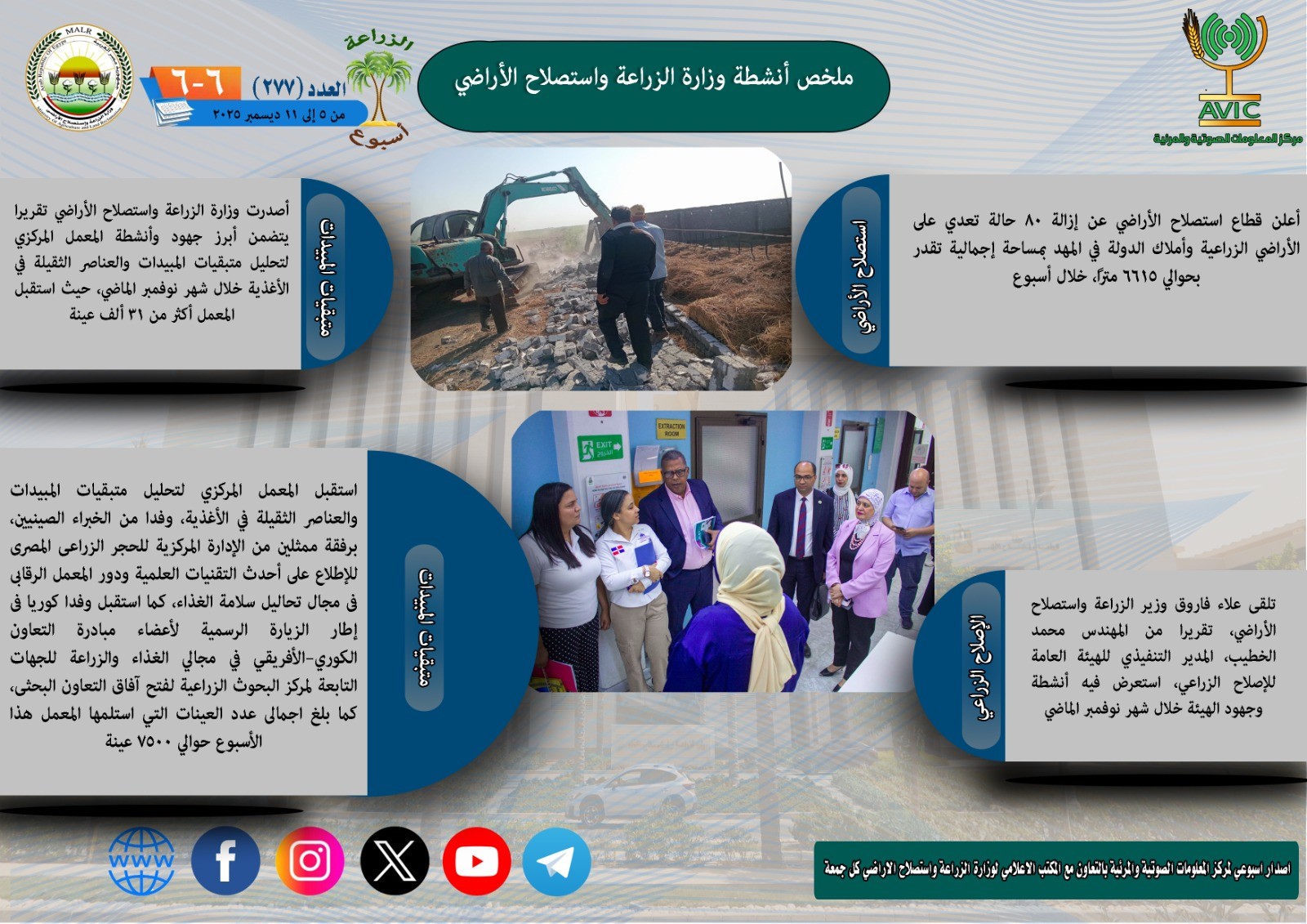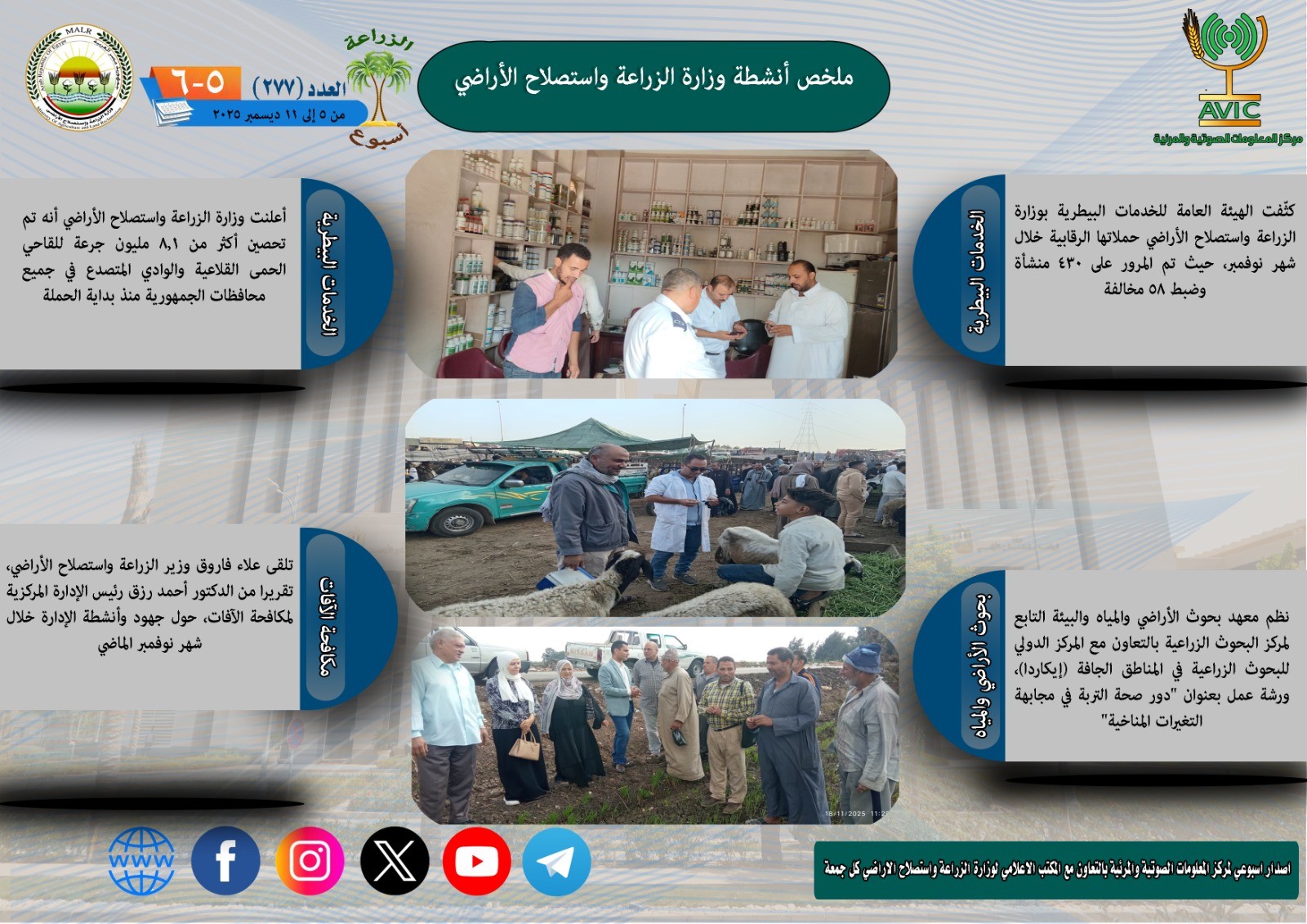 ونشرت الوزارة أيضا تقريرا عن الهيئة العامة للإصلاح الزراعي، استعرضت فيه أنشطة وجهود الهيئة خلال شهر نوفمبر الماضي