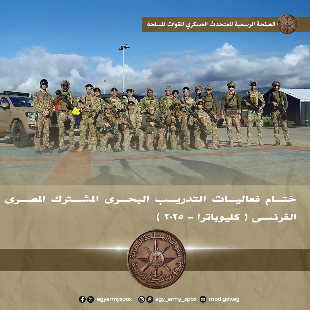 إختتمت فعاليات التدريب البحرى المشترك المصرى الفرنسى ( كليوباترا – 2025 ) ، والذى إستمرت فعالياته لعدة أيام بالمياه الإقليمية الفرنسية بمشاركة عدد من الوحدات البحرية وعناصر من القوات الخاصة البحرية المصرية والفرنسية.