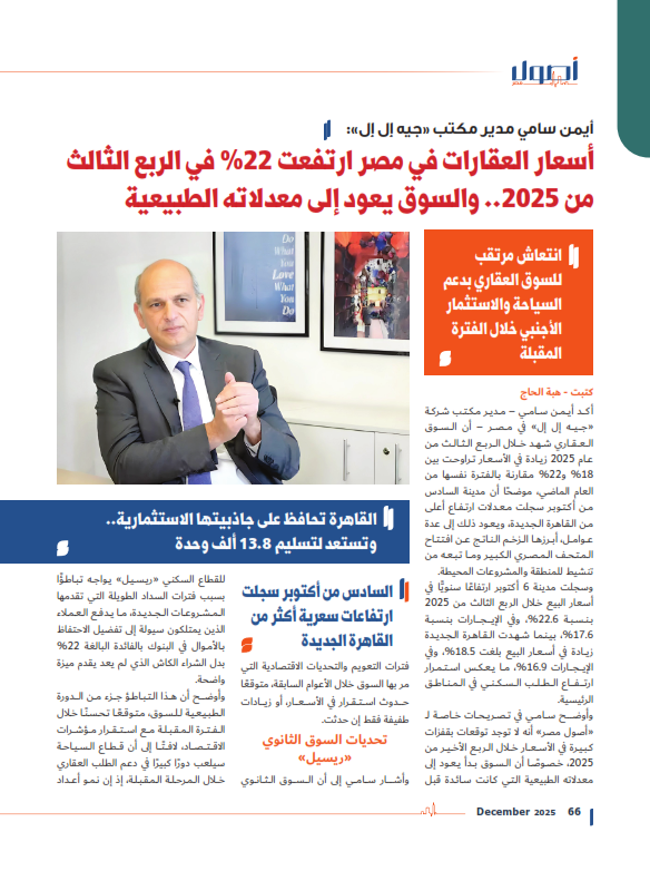 أيمن سامي : أسعار العقارات في مصر ارتفعت 22% في الربع الثالث من 2025.. والسوق يعود إلى معدلاته الطبيعية