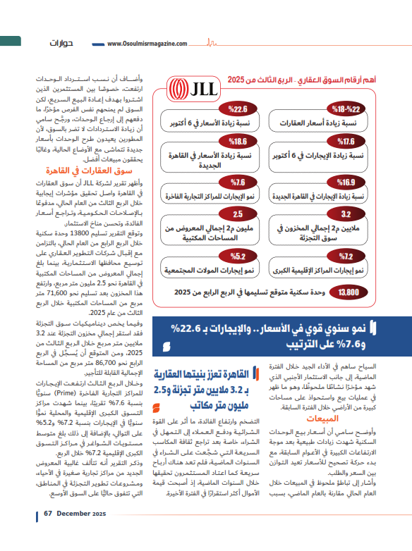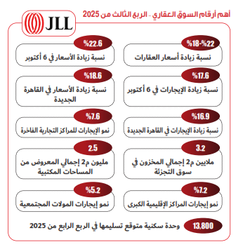 وأظهر تقرير لشركة JLL أن سوق العقارات في القاهرة واصل تحقيق مؤشرات إيجابية خلال الربع الثالث من العام الحالي، مدفوعًا بالإصلاحات الحكومية، وتراجع أسعار الفائدة، وتحسن مناخ الاستثمار.
