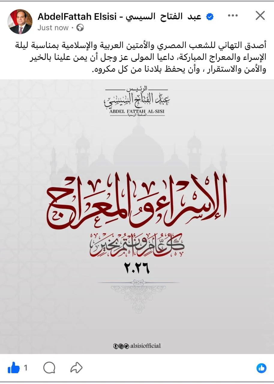 جاء ذلك خلال منشور على الحسابات الرسمية للرئيس السيسي على مواقع التواصل الاجتماعي.