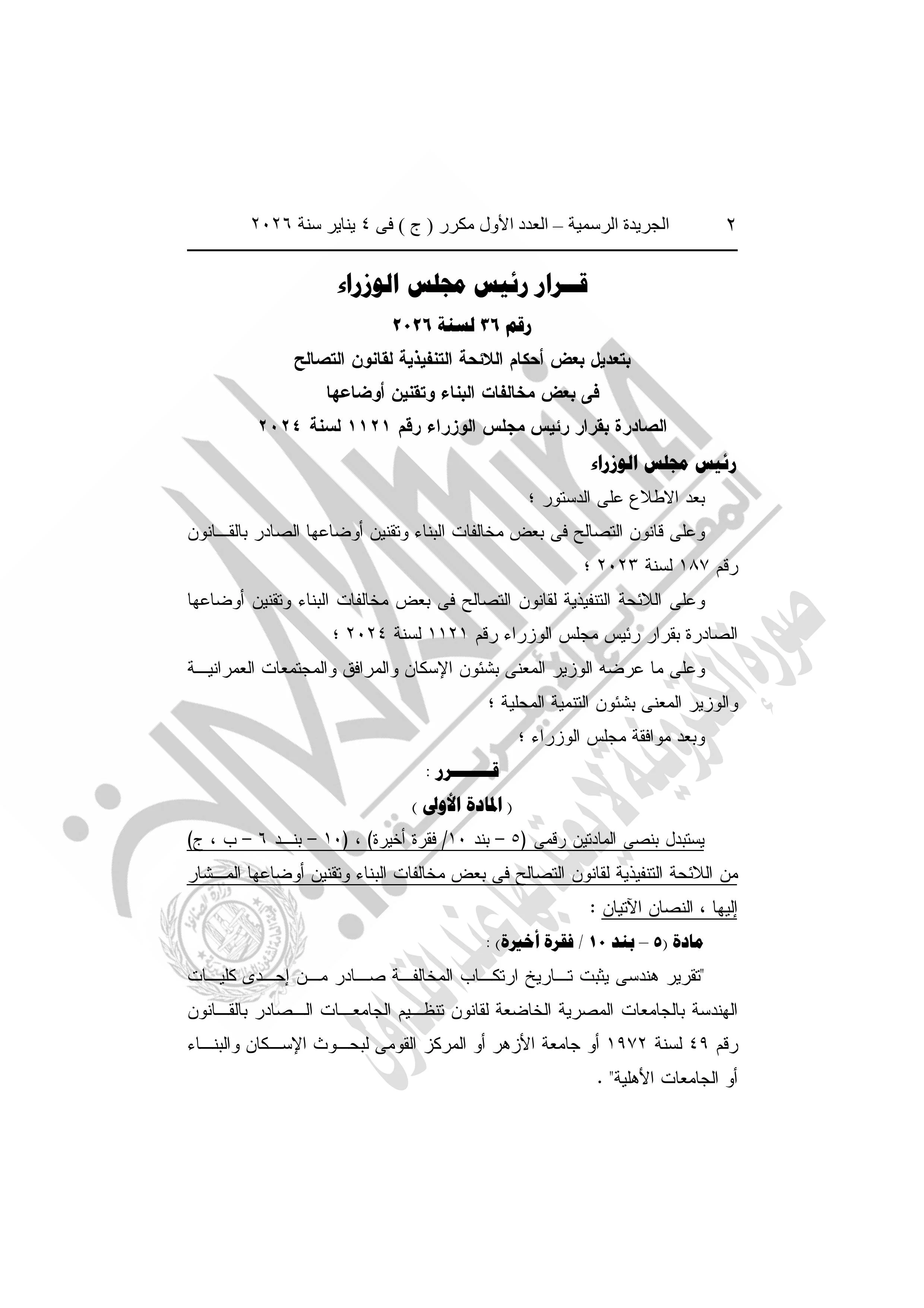 وجاء القرار بعد الاطلاع على الدستور، وعلى قانون التصالح في بعض مخالفات البناء وتقنين أوضاعها الصادر بالقانون رقم 187 لسنة 2023، وعلى اللائحة التنفيذية لقانون التصالح في بعض مخالفات البناء وتقنين أوضاعها الصادرة بقرار رئيس مجلس الوزراء رقم 1121 لسنة 2024، وعلى ما عرضه الوزير المعني بشؤون الإسكان والمرافق والمجتمعات العمرانية والوزير المعني بشؤون التنمية المحلية، وبعد موافقة مجلس الوزراء.