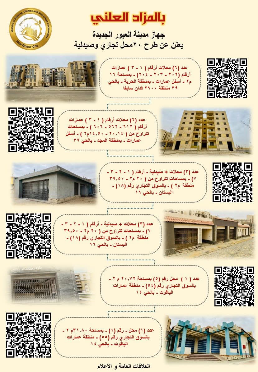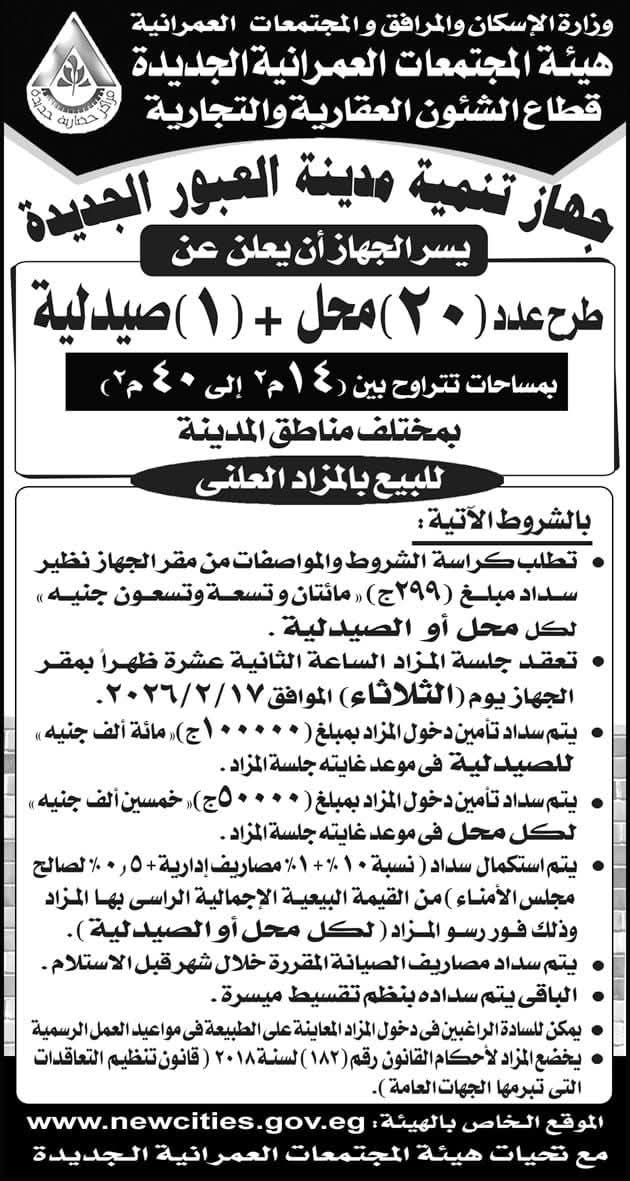 يعلن جهاز مدينة العبور الجديدة عن طرح عدد (20) محلًا تجاريًا وصيدلية بمواقع متميزة بعدة مناطق وأحياء داخل المدينة، وذلك في إطار خطة الجهاز لدعم الأنشطة التجارية والخدمية، وتوفير فرص استثمارية متنوعة تلبي احتياجات السكان وتعزز مناخ الاستثمار بالمدينة وسوف يقام المزاد يوم 17/2/2026