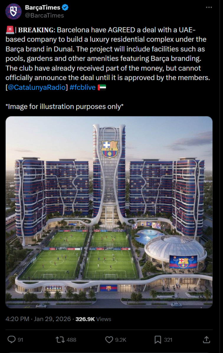 وبحسب التقارير، توصل النادي الكتالوني إلى اتفاق مالي ضخم مع مستثمرين من دولة الإمارات العربية المتحدة، يسمح باستخدام العلامة التجارية لنادي برشلونة في مشروع عقاري متكامل يضم شققاً فاخرة وفيلات، إلى جانب مرافق خدمية وترفيهية، جميعها تحمل شعار النادي وهويته البصرية.
