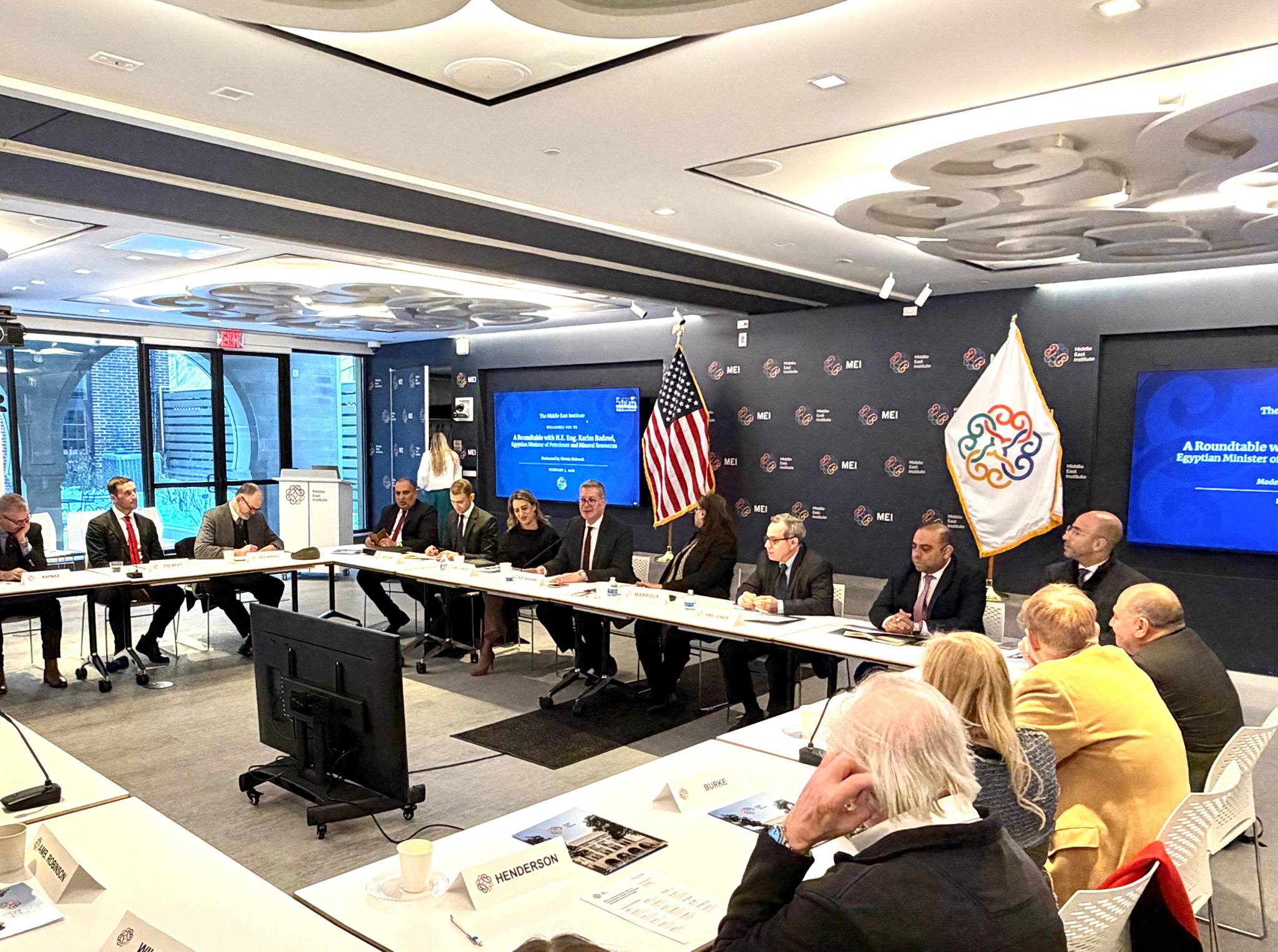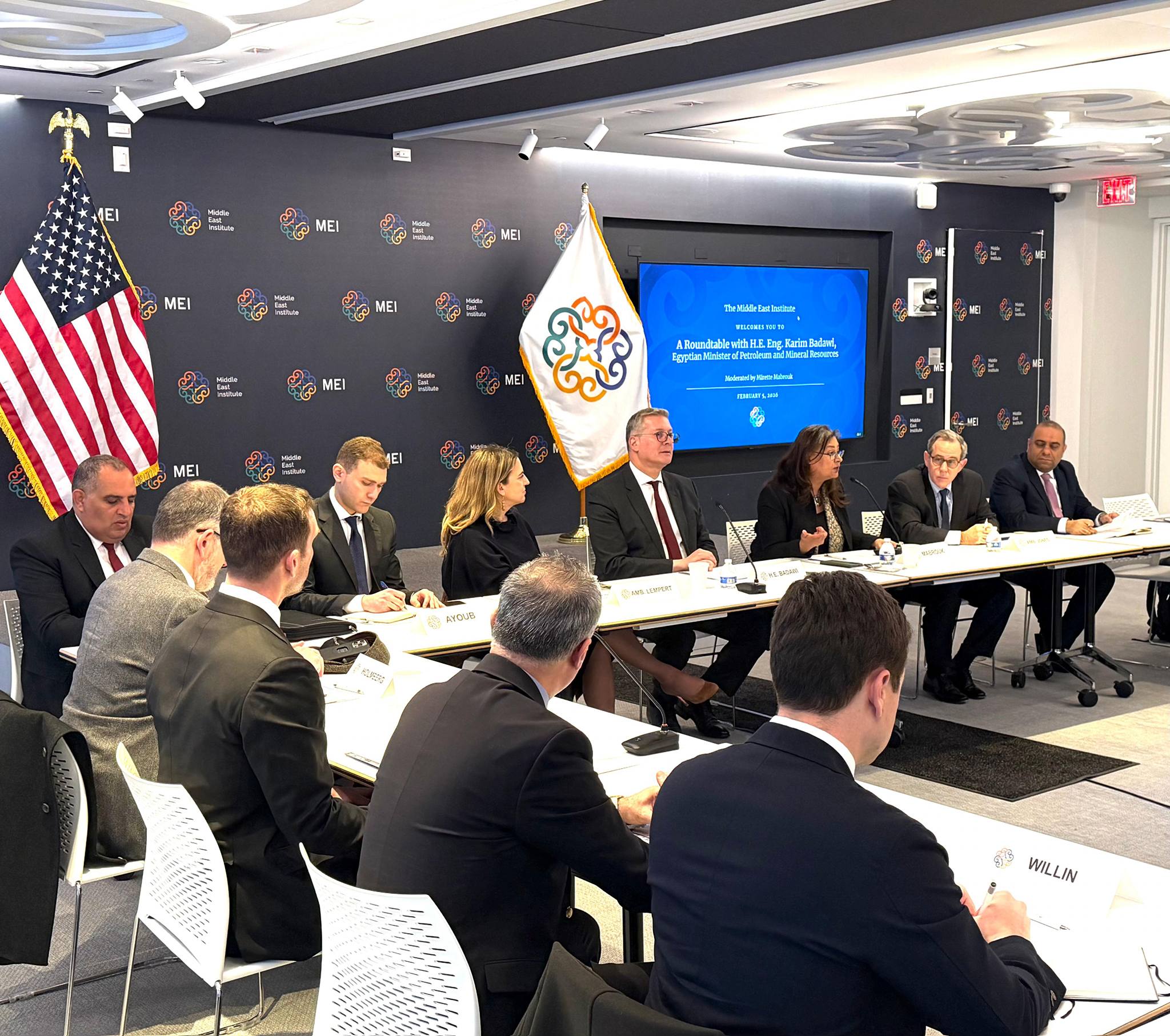 استضاف معهد الشرق الأوسط بواشنطن MEI ، المهندس كريم بدوي وزير البترول والثروة المعدنية في لقاء مائدة مستديرة موسع بحضور لفيف من الخبراء والمتخصصين في شئون الشرق الأوسط ، حيث جري إلقاء الضوء علي الدور المحوري لمصر كمركز إقليمي لتداول وتجارة الطاقة