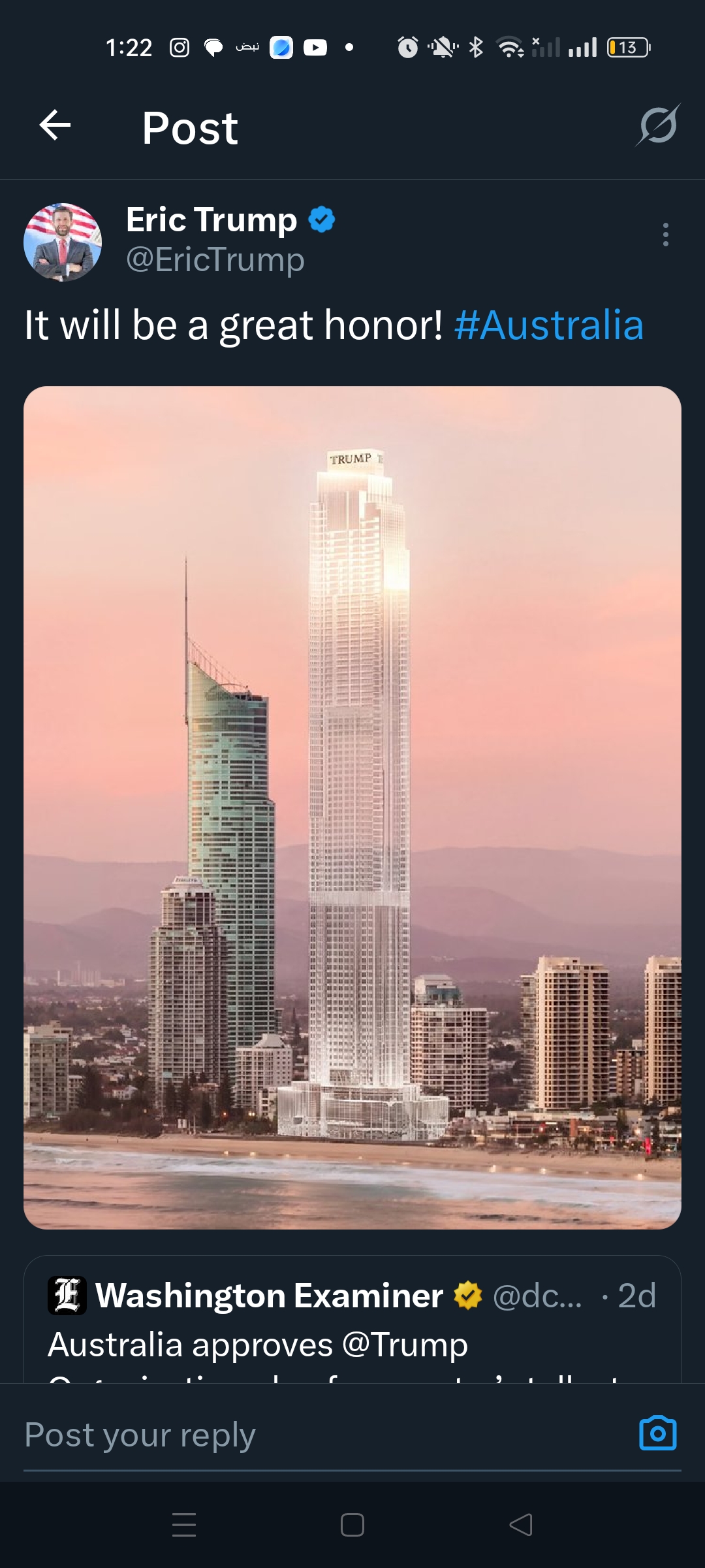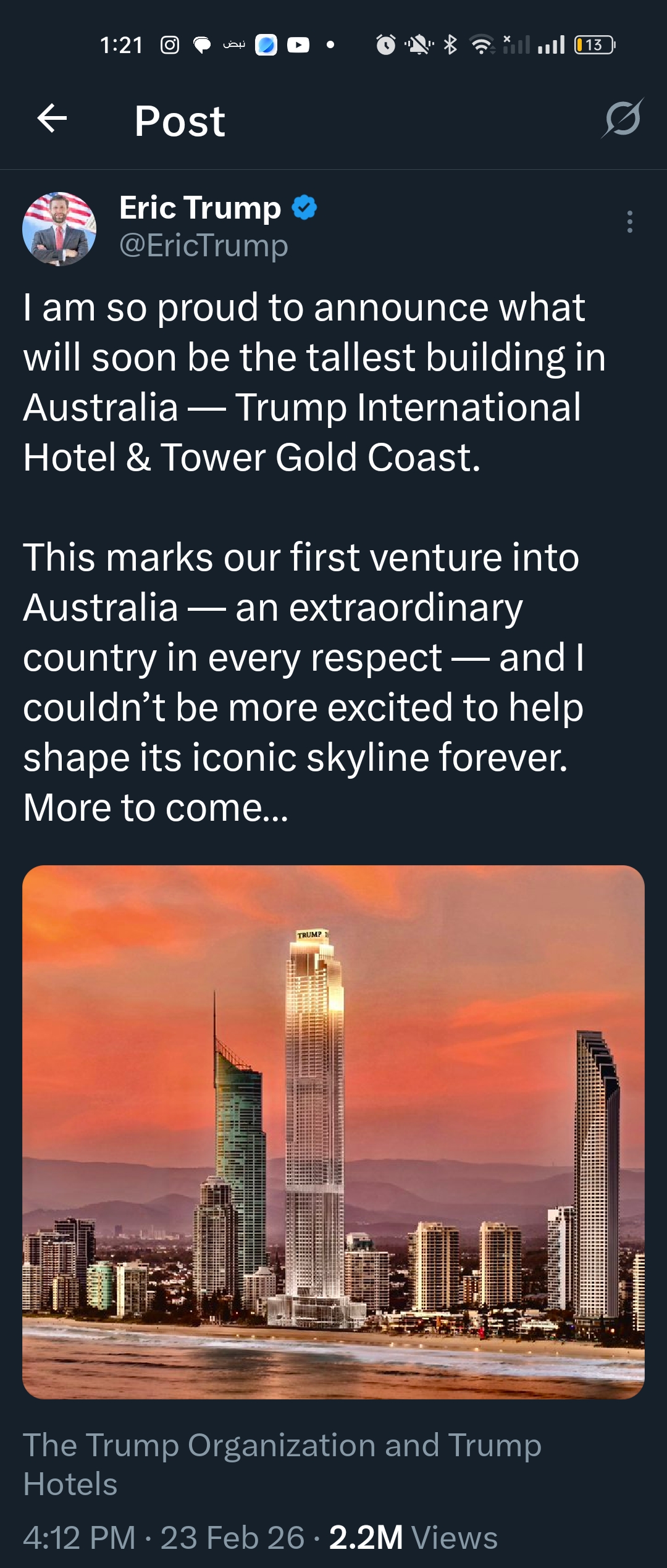 وقال إريك ترامب على صفحته على منصة إكس: "أنا فخور للغاية بالإعلان عمّا سيصبح قريبًا أطول مبنى في أستراليا — ترامب إنترناشيونال هوتيل آند تاور غولد كوست.