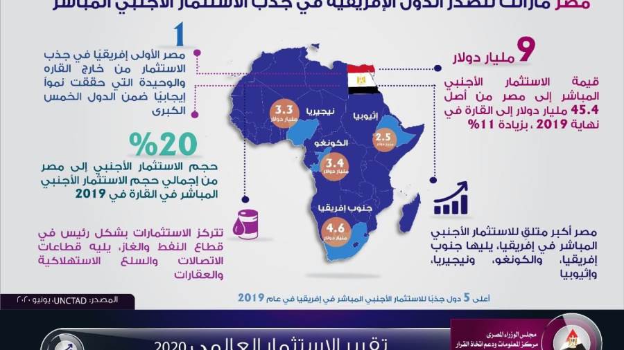 أعلنت منظمة الأونكتاد في أحدث تقرير لها أن مصر الأولى إفريقيا في جذب الاستثمارات الأجنبية.