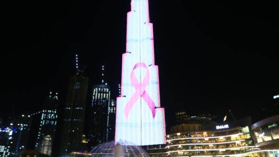 أضاء برج خليفة أعلى برج في العالم باللون الوردي مساء الأربعاء وعرض رسالة تحث الناس على الانضمام إلى القتال من