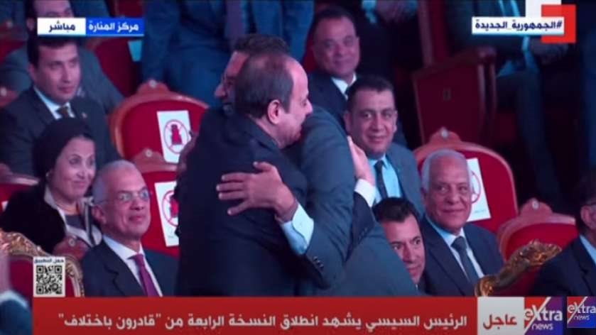 احتضن الرئيس عبدالفتاح السيسي، أحد الشباب من ذوي الهمم، وذلك خلال فعاليات النسخة الرابعة من «قادرون باختلاف» المقامة تحت شعار «لينا مكان»، بقاعة مركز المنارة للمؤتمرات بالتجمع.