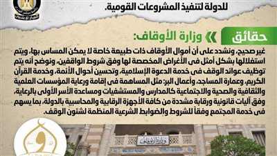 وأكدت الوزارة - فى بيان اليوم - أن تحقيق هيئة الأوقاف المصرية هذه القفزة الجديدة وغير المسبوقة فى الإيرادات، يأتى فى ضوء اهتمام ومتابعة الرئيس عبدالفتاح السيسى لشؤون الوقف وحسن استثماره، وحرصه على استيداء وتحصيل جميع حقوق الوقف بالقيمة السوقية العادلة وإنفاق عوائده فى مصارفها الشرعية.
