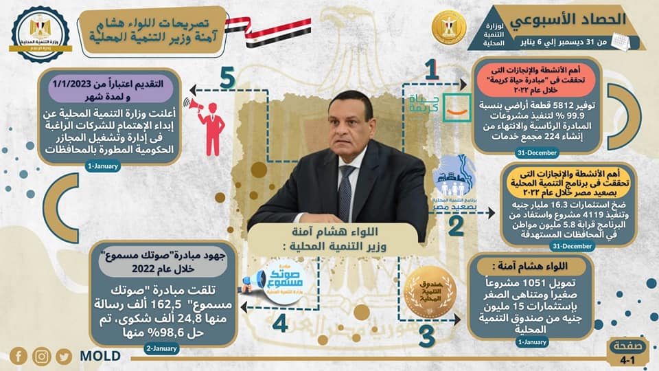 الحصاد الأسبوعي لوزارة التنمية المحلية في الفترة من 31 ديسمبر إلي 6 يناير