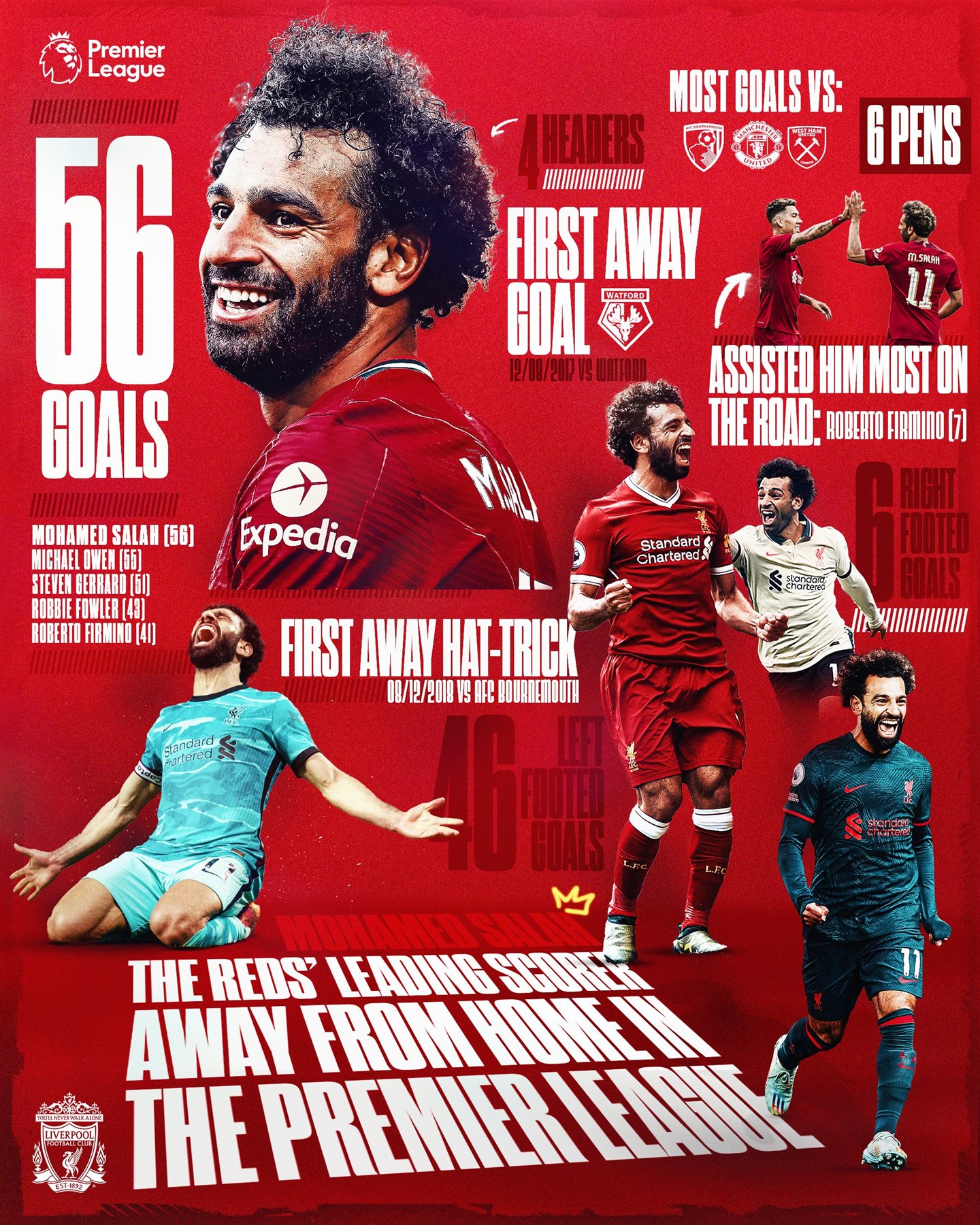وأصبح محمد صلاح، الهداف التاريخي لـ ليفربول في الدوري الإنجليزي خارج ملعب أنفيلد برصيد 56 هدفا.