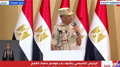 وأضاف وزير التموين، خلال كلمته في افتتاح موسم حصاد القمح من شرق العوينات وافتتاح مصنع البطاطس بحضور الرئيس عبد الفتاح السيسي: "سعر القمح المحلي جزء أساسي في هذا الموسم.. ونقارن الموقف الحالي لعملية الحصاد مقارنة مع العام السابق.. المساحة وفق بيانات الزراعة 3.2 مليون فدان يتم إنتاج قمح بمتوسط 18 – 20 أردب.. يعني حوالي 10 ملايين طن إنتاج مصر.