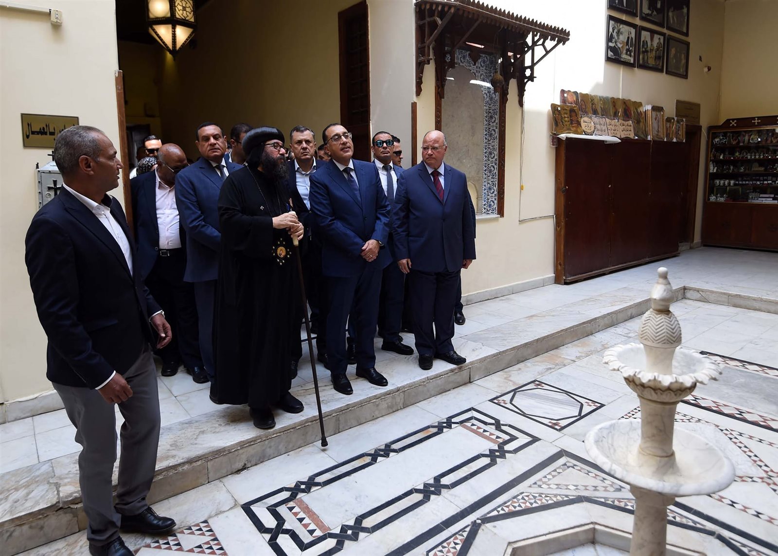 وانتقل رئيس الوزراء ومرافقوه، إلى "الكنيسة المُعلقة" بمنطقة مجمع الأديان بمصر القديمة، حيث كان في استقباله الأنبا يوليوس، أسقف الخدمات العامة وأسقف عام كنائس مصر القديمة، والذي بدوره قام باستعراض أبرز ملامح الكنيسة المُعلقة، موضحًا أن الكنيسة تقع في حي مصر القديمة في منطقة القاهرة القبطية الأثرية، وهي أشهر كنيسة قبطية مسيحية في القاهرة بُنيت على الطراز البازيليكي، ويعزي سبب تسميتها بهذا الاسم لأنها بُنيت على برجين من الأبراج القديمة للحصن الروماني "حصن بابليون".