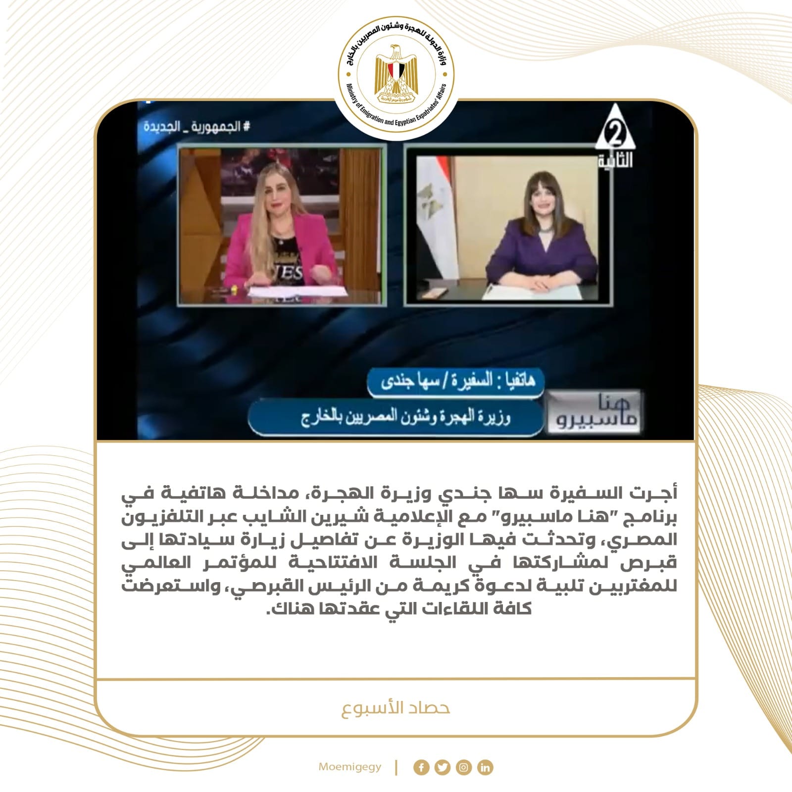 أجرت السفيرة سها جندي وزيرة الهجرة، مداخلة هاتفية في برنامج "هنا ماسبيرو" مع الإعلامية شيرين الشايب عبر التلفزيون المصري، وتحدثت فيها الوزيرة عن تفاصيل زيارة سيادتها إلى قبرص لمشاركتها في الجلسة الافتتاحية للمؤتمر العالمي للمغتربين تلبية لدعوة كريمة من الرئيس القبرصي، واستعرضت كافة اللقاءات التي عقدتها هناك.
