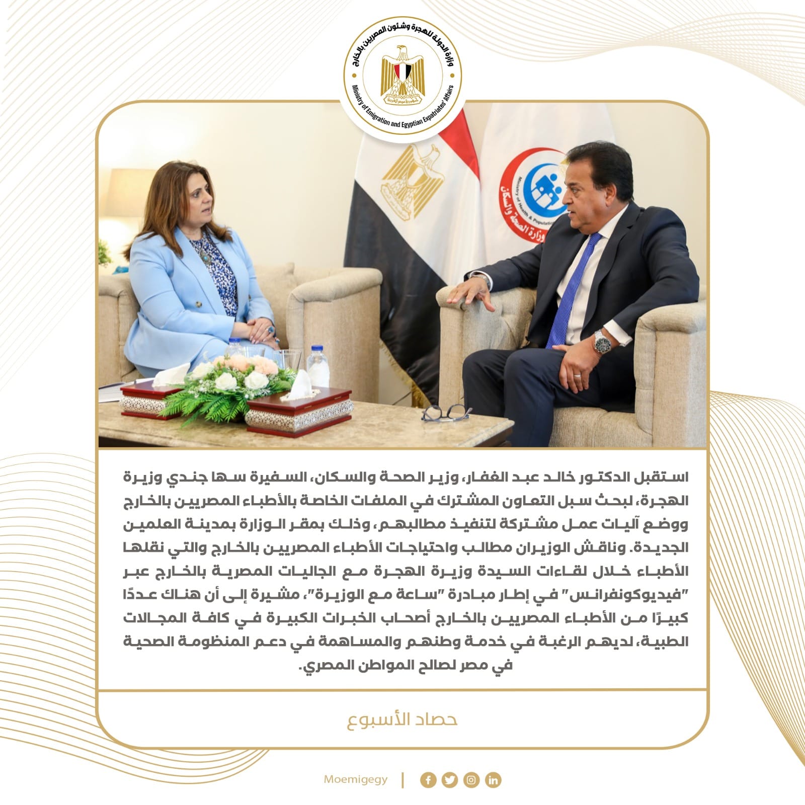 كما استقبل الدكتور خالد عبد الغفار، وزير الصحة والسكان، السفيرة سها جندي وزيرة الهجرة، لبحث سبل التعاون المشترك في الملفات الخاصة بالأطباء المصريين بالخارج ووضع آليات عمل مشتركة لتنفيذ مطالبهم، وذلك بمقر الوزارة بمدينة العلمين الجديدة. وناقش الوزيران مطالب واحتياجات الأطباء المصريين بالخارج والتي نقلها الأطباء خلال لقاءات السيدة وزيرة الهجرة مع الجاليات المصرية بالخارج عبر "فيديوكونفرانس" في إطار مبادرة "ساعة مع الوزيرة"، مشيرة إلى أن هناك عددًا كبيرًا من الأطباء المصريين بالخارج أصحاب الخبرات الكبيرة في كافة المجالات الطبية، لديهم الرغبة في خدمة وطنهم والمساهمة في دعم المنظومة الصحية في مصر لصالح المواطن المصري.