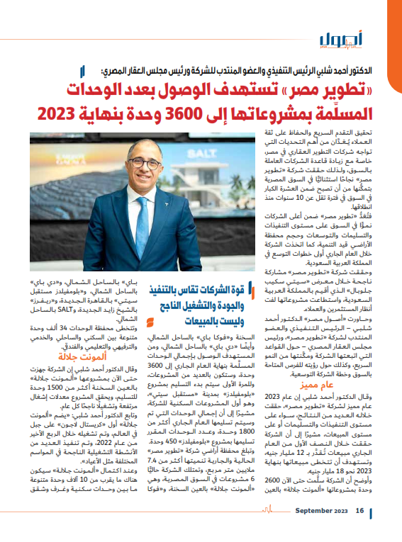 وحاورت «أصول مصر» الدكتور أحمد شلبي – الرئيس التنفيذي والعضو المنتدب لشركة «تطوير مصر»، ورئيس مجلس العقار المصري – حول القواعد التي اتبعتها الشركة ومكَّنتها من النمو السريع، وكذلك حول رؤيته للفرص المتاحة بالسوق وخطة الشركة التوسعية.