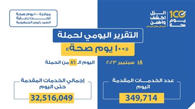 أعلن الدكتور خالد عبدالغفار وزير الصحة والسكان، تقديم 33 مليونا و549 ألفا و815 خدمة طبية من خلال حملة «100 يوم صحة» منذ انطلاقها يوم 25 يونيو الماضي، وحتى مساء أمس الخميس 21 سبتمبر، في جميع محافظات الجمهورية.