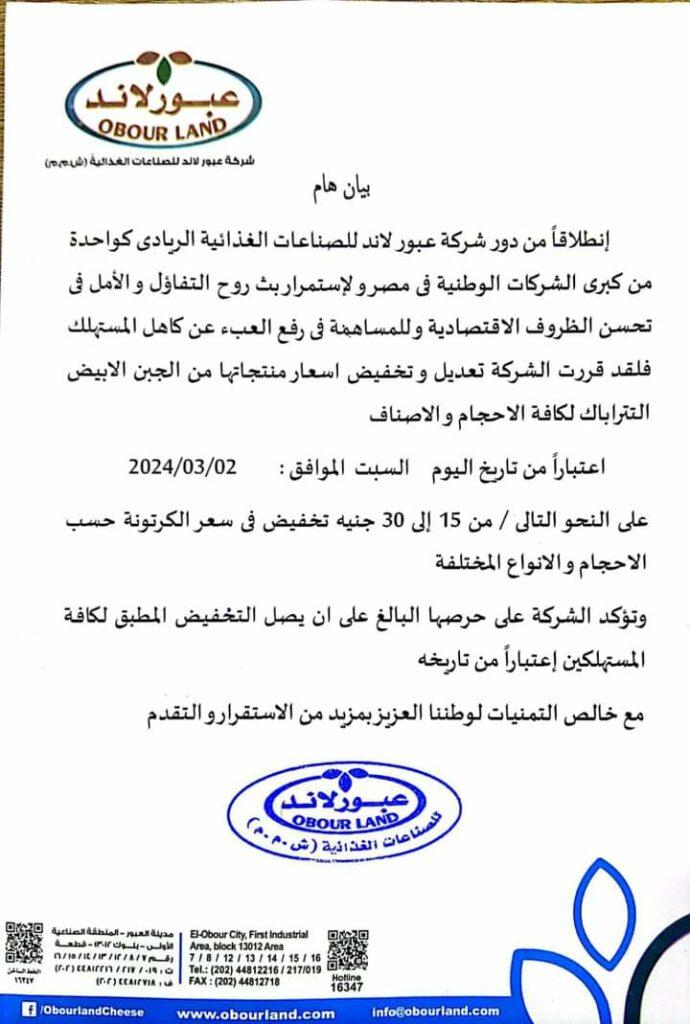 وأصدرت شركة عبور لاند بيانا، أوضحت فيه أنه إنطلاقًا من دور شركة عبور لاند للصناعات الغذائية الريادي كواحدة من كبرى الشركات الوطنية فى مصر والإستمرار بث روح التفاؤل والأمل في تحسن الظروف الاقتصادية وللمساهمة فى رفع العبء عن كاهل المستهلك فلقد قررت الشركة تعديل وتخفيض اسعار منتجاتها من الجبن الابيض التتراباك لكافة الاحجام والاصناف.