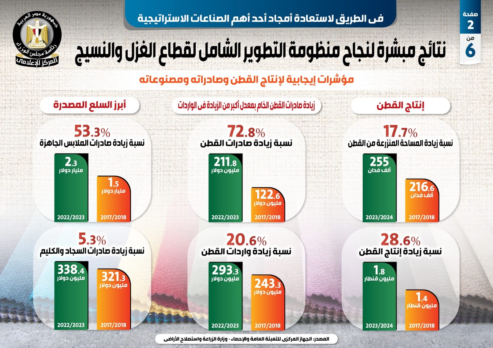 وفي هذا الصدد نشر المركز الإعلامي لمجلس الوزراء تقريرًا تضمن إنفوجرافات تسلط الضوء على النتائج المبشرة لنجاح منظومة التطوير الشامل لقطاع الغزل والنسيج، وذلك في الطريق لاستعادة أمجاد أحد أهم الصناعات الاستراتيجية.