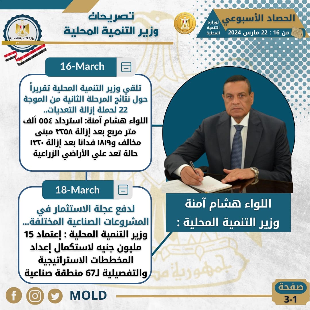 الحصاد الأسبوعي لـ«التنمية المحلية» في الفترة من 16 حتي 22 مارس 2024