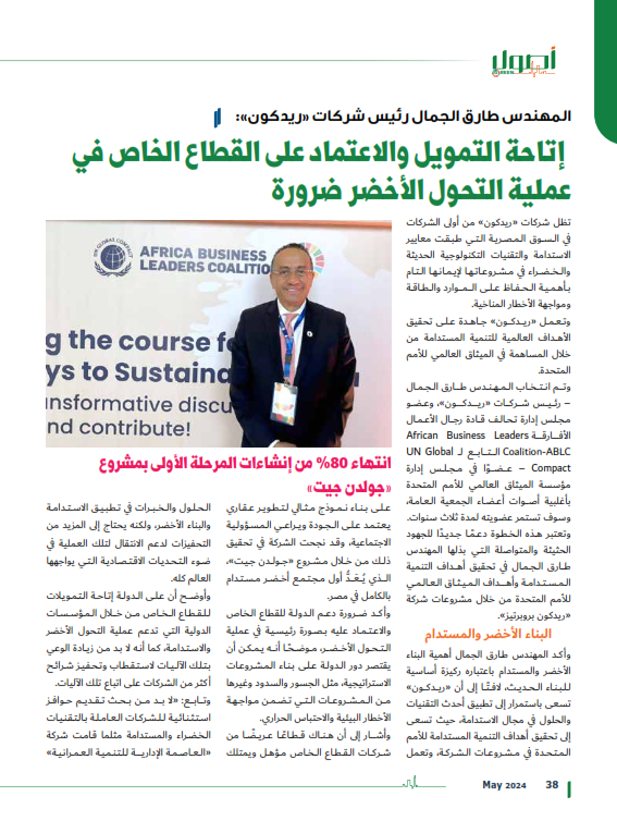 وأكد المهندس طارق الجمال أهمية البناء الأخضر والمستدام باعتباره ركيزة أساسية للبناء الحديث، لافتًا إلى أن «ريدكون» تسعى باستمرار إلى تطبيق أحدث التقنيات والحلول في مجال الاستدامة، حيث تسعى إلى تحقيق أهداف التنمية المستدامة للأمم المتحدة في مشروعات الشركة، وتعمل على بناء نموذج مثالي لتطوير عقاري يعتمد على الجودة ويراعي المسؤولية الاجتماعية، وقد نجحت الشركة في تحقيق ذلك من خلال مشروع «جولدن جيت»، الذي يُعَدُّ أول مجتمع أخضر مستدام بالكامل في مصر.