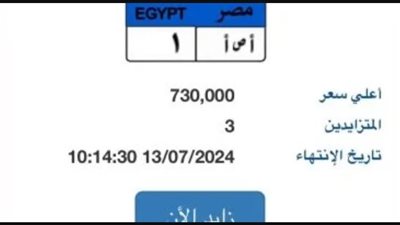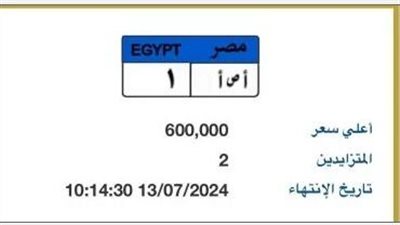 أعلنت بوابة مرور مصر الإلكترونية، مزايدة على لوحة معدنية مميزة للسيارات، سعرها وصل 730 الف جنيه، تحمل رقم ( أ ص أ- 1) وحتى الآن متزايد عليها 3 أشخاص.