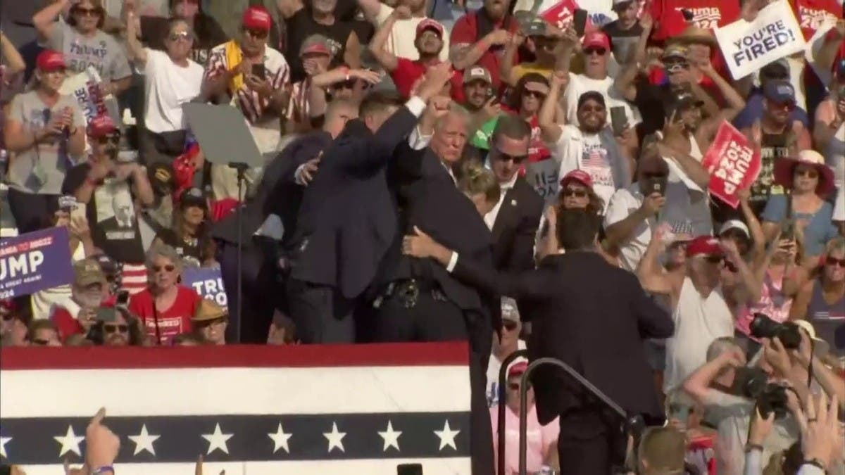 وسمع دوي انفجارات قوية قبل سقوط ترامب. ثم ساعده العناصر على الوقوف، وكانت الدماء على وجهه. كان يصرخ مرة أخرى على الحشد ورفع قبضته. ومن ثم تم نقله إلى سيارة وإجلائه من مكان الحادث.
