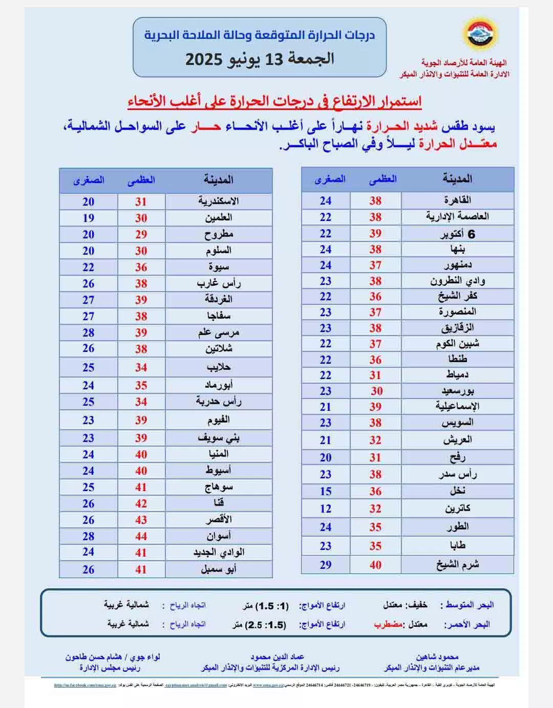 كشفت الهيئة العامة للأرصاد الجوية، عن حالة الطقس المتوقعة غدًا الجمعة الموافق 13 يونيو 2025 على معظم أنحاء البلاد.