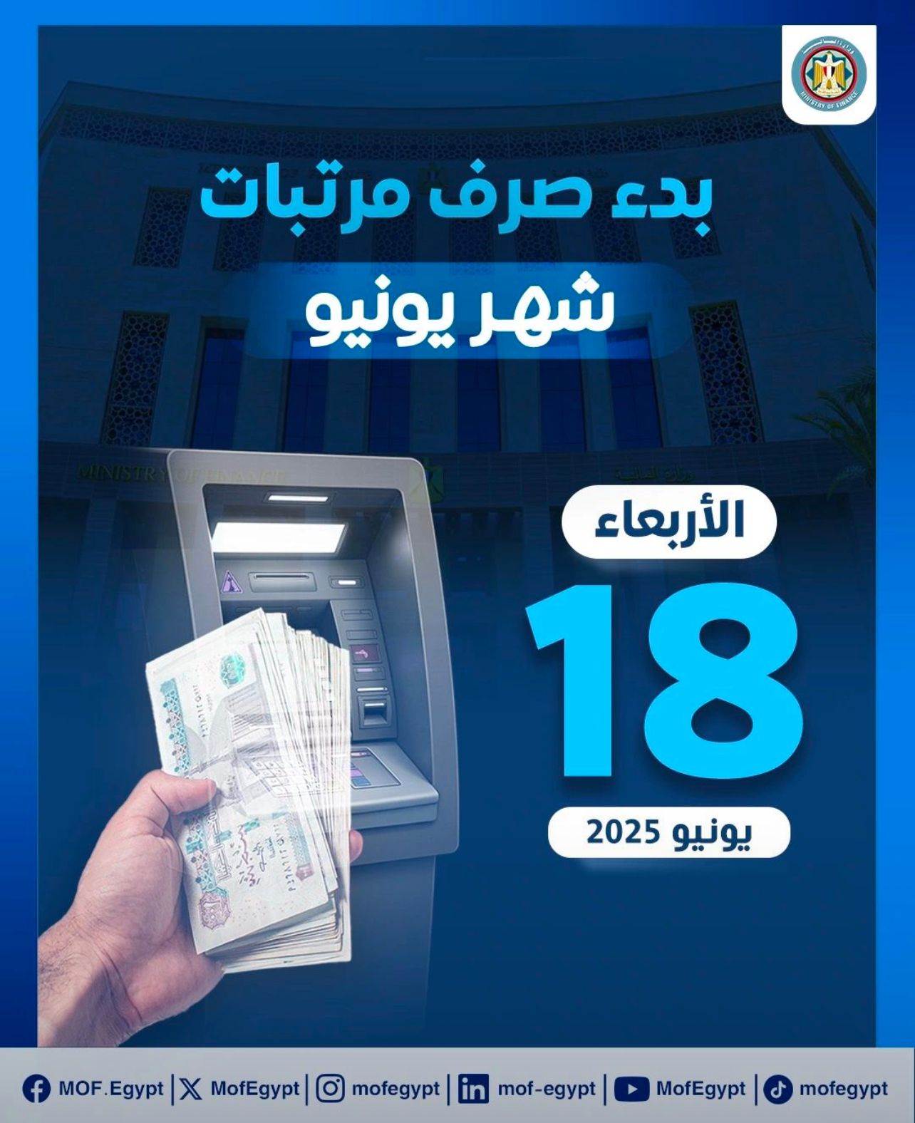 المالية: بدء صرف مرتبات الشهر الجاري للعاملين بالدولة اعتبارًا من الأربعاء 18 يونيو