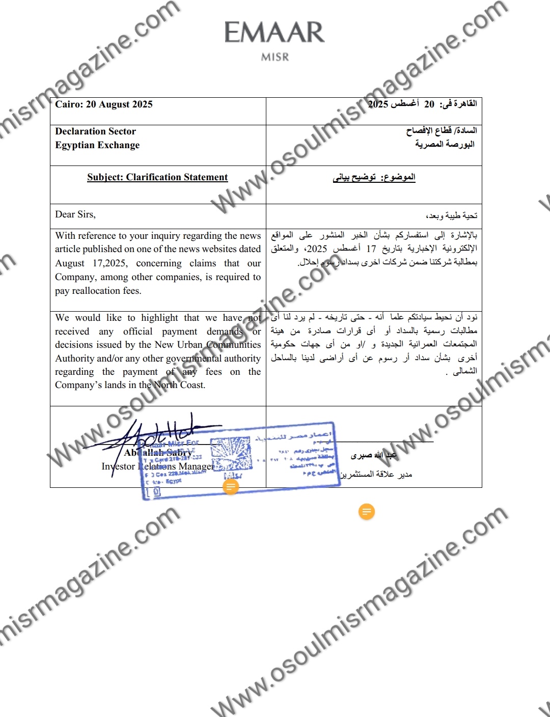 وأكدت شركة إعمار مصر للتنمية عدم تلقي أي مطالبات رسمية من هيئة المجتمعات العمرانية الجديدة أو أي جهة حكومية بشأن سداد رسوم عن أي أراضي لدينا بالساحل الشمالي، وفق بيان إفصاح اليوم.