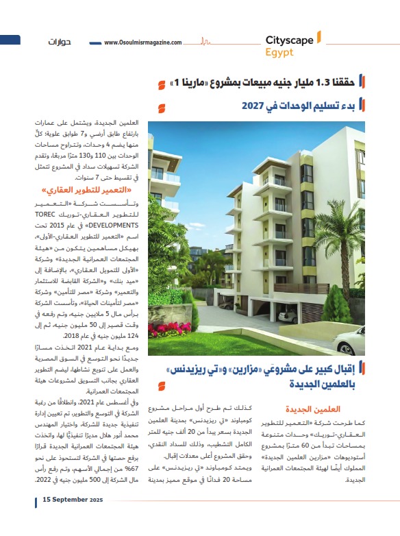 ومن ضمن المشروعات التي طرحت بها شركة «توريك» وحدات خلال موسم صيف 2025 مشروع «مارينا 1»، وحققت الشركة مبيعات بالمشروع 1.3 مليار جنيه.