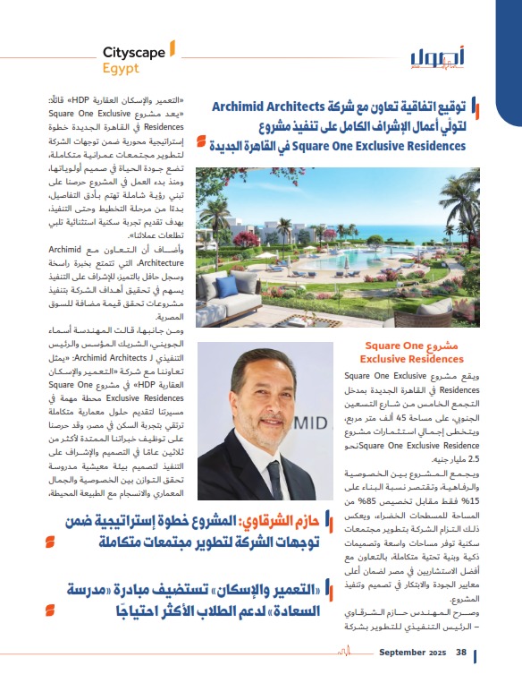 ووقَّعت شركة «التعمير والإسكان العقارية HDP» اتفاقية تعاون مع شركة Archimid Architects للتصميم المعماري لتولِّي أعمال الإشراف الكامل على تنفيذ مشروعها السكني Square One Exclusive Residences في القاهرة الجديدة.