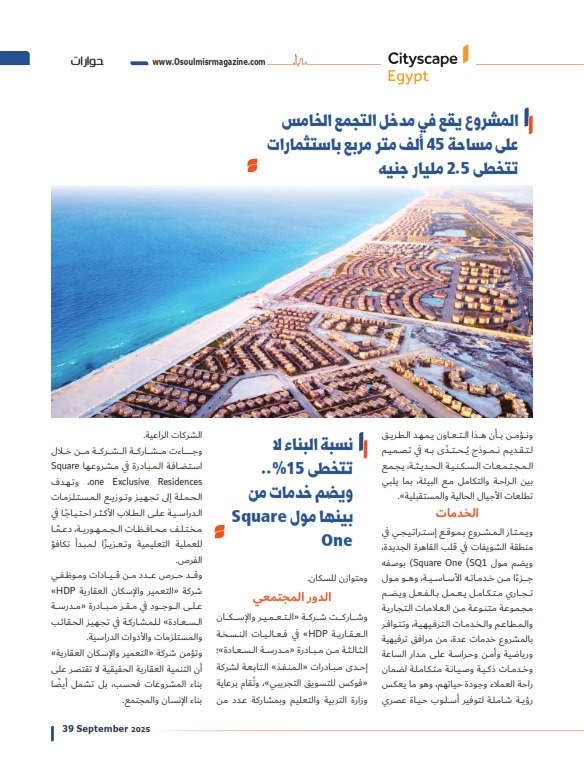 وصرح المهندس حازم الشرقاوي – الرئيس التنفيذي للتطوير بشركة «التعمير والإسكان العقارية HDP» قائلًا: «يعد مشروع Square One Exclusive Residences في القاهرة الجديدة خطوة إستراتيجية محورية ضمن توجهات الشركة لتطوير مجتمعات عمرانية متكاملة، تضع جودة الحياة في صميم أولوياتها، ومنذ بدء العمل في المشروع حرصنا على تبني رؤية شاملة تهتم بأدق التفاصيل، بدءًا من مرحلة التخطيط وحتى التنفيذ، بهدف تقديم تجربة سكنية استثنائية تلبي تطلعات عملائنا».
