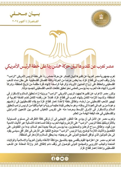 أعربت مصر عن تقديرها للبيان الصادر عن حركة حماس ردًا على خطة الرئيس الأمريكي دونالد ترامب بشأن وقف الحرب في قطاع غزة، بما يعكس حرصاً من الحركة وكافة الفصائل الفلسطينية على حقن دماء الشعب الفلسطيني والحفاظ على أرواح المدنيين الأبرياء، والرغبة الراسخة لإنهاء فترة مظلمة من تاريخ المنطقة، وإدراكاً لضرورة إنهاء هذه الحرب، بما يؤسس للمضي نحو تحقيق تطلعاته نحو تجسيد الدولة الفلسطينية.
