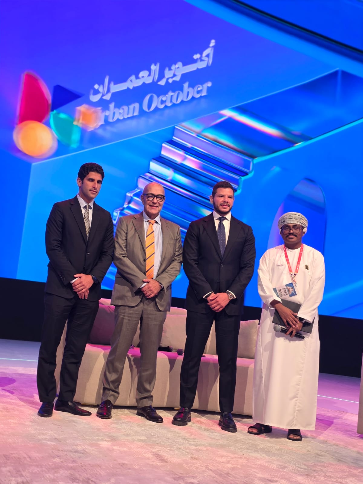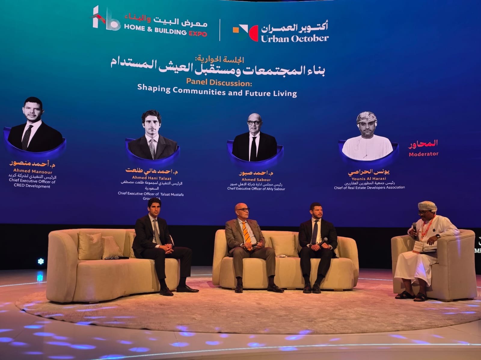 أقيم على هامش فعاليات معرض أكتوبر العمران المنعقد حالياً بسلطنة عمان جلسة حوارية بعنوان بناء المجتمعات ومستقبل العيش المستدام وادارها يونس الحراصي رئيس جمعية المطورين العقاريين بسلطنة عمان وتحدث بها المهندس أحمد صبور رئيس مجلس إدارة شركة الأهلي صبور ، المهندس أحمد منصور الرئيس التنفيذي لشركة cred ، المهندس أحمد هانى طلعت الرئيس التنفيذي لمجموعة طلعت مصطفي السعودية .