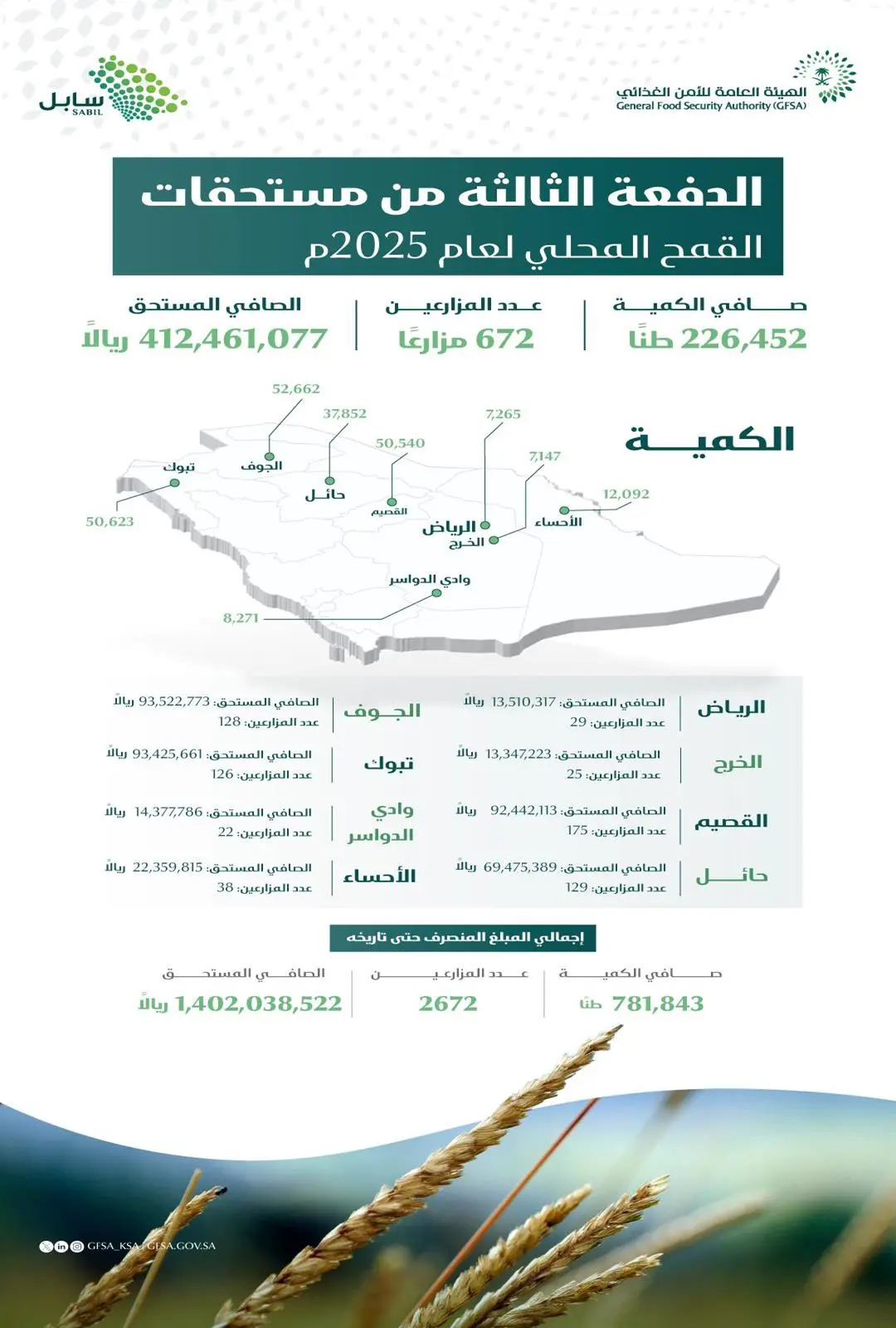 أعلنت الهيئة العامة للأمن الغذائي عن صرف مستحقات الدفعة الثالثة لمزارعي القمح المحلي الذين قاموا بتوريد الكميات المخصصة لهم لموسم 1446/1447هـ (2025م).