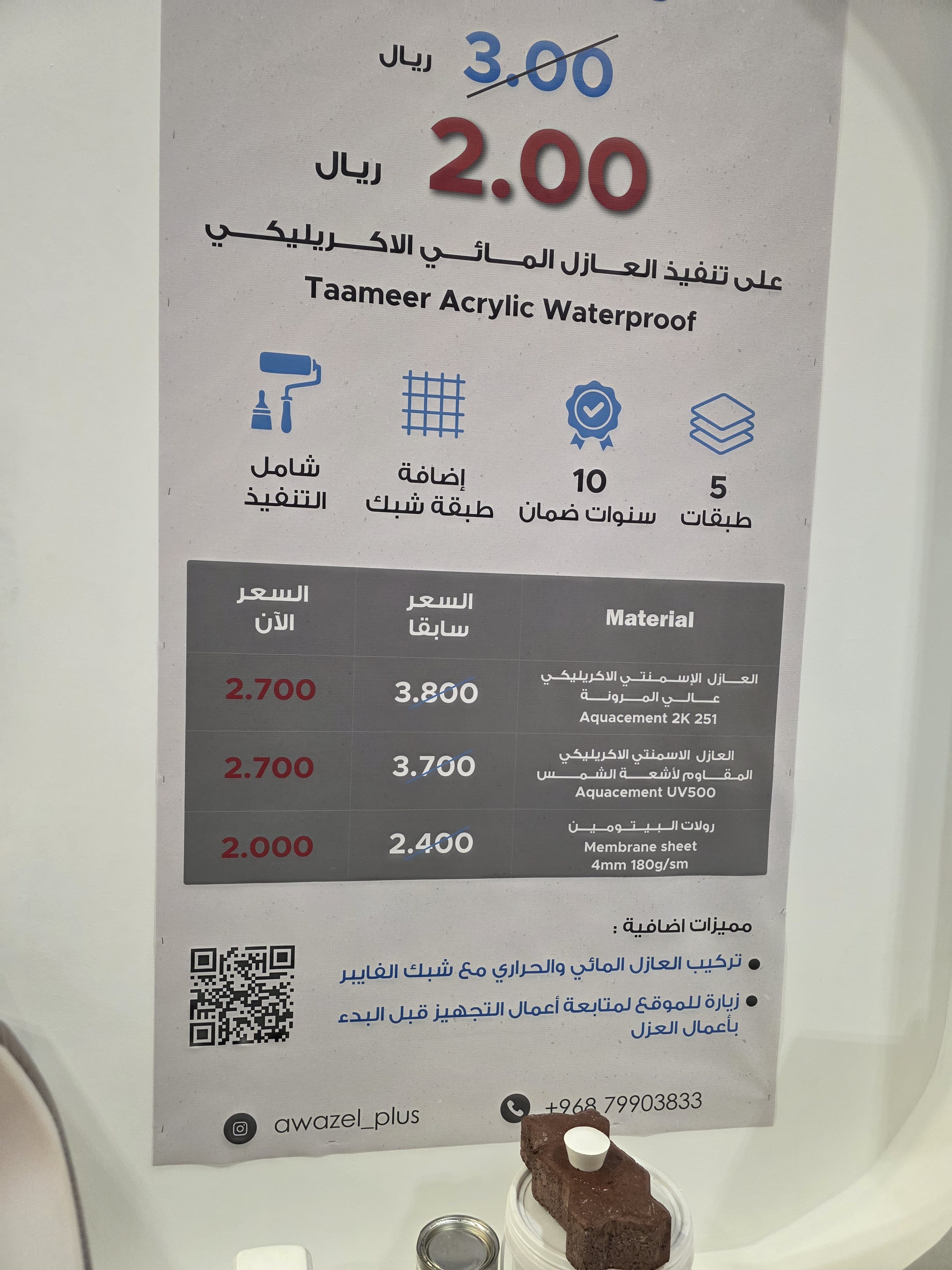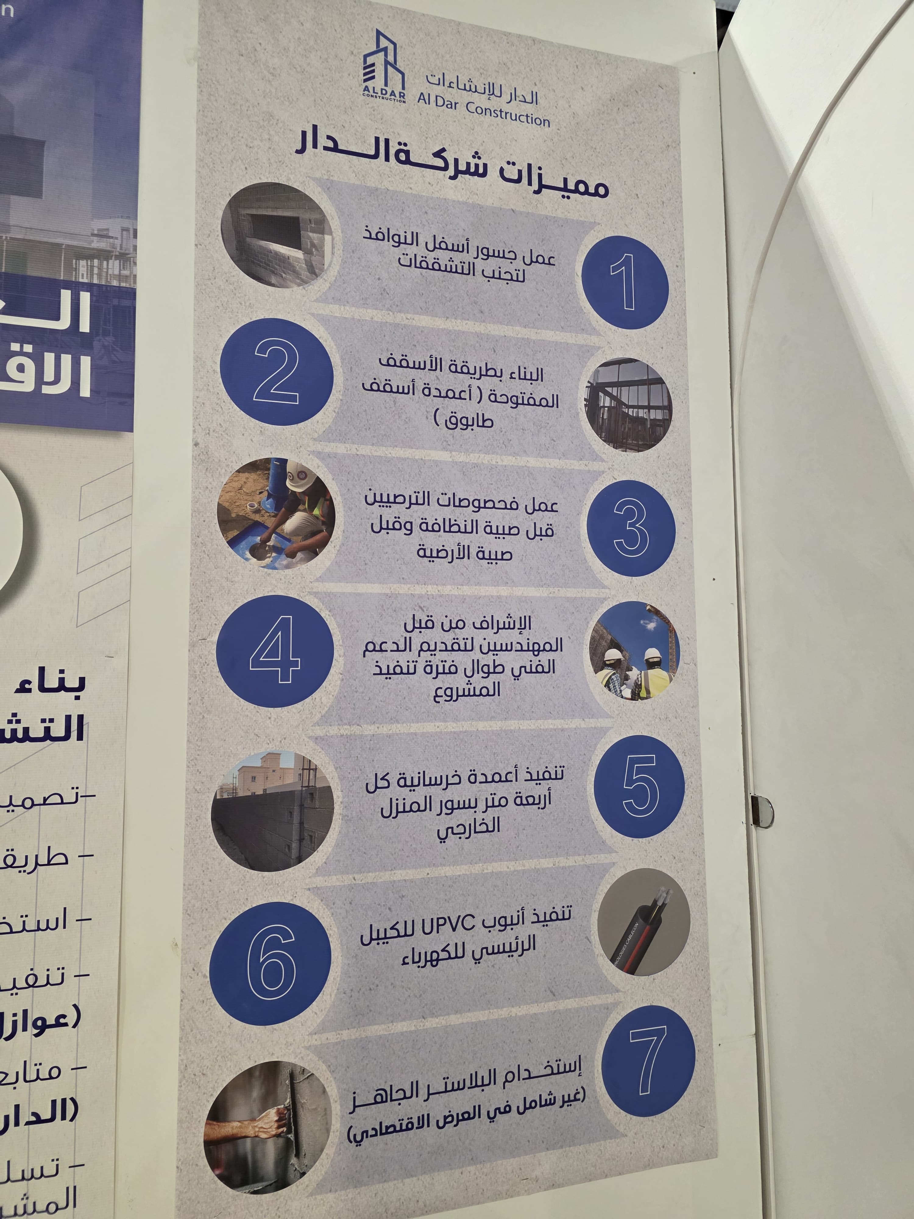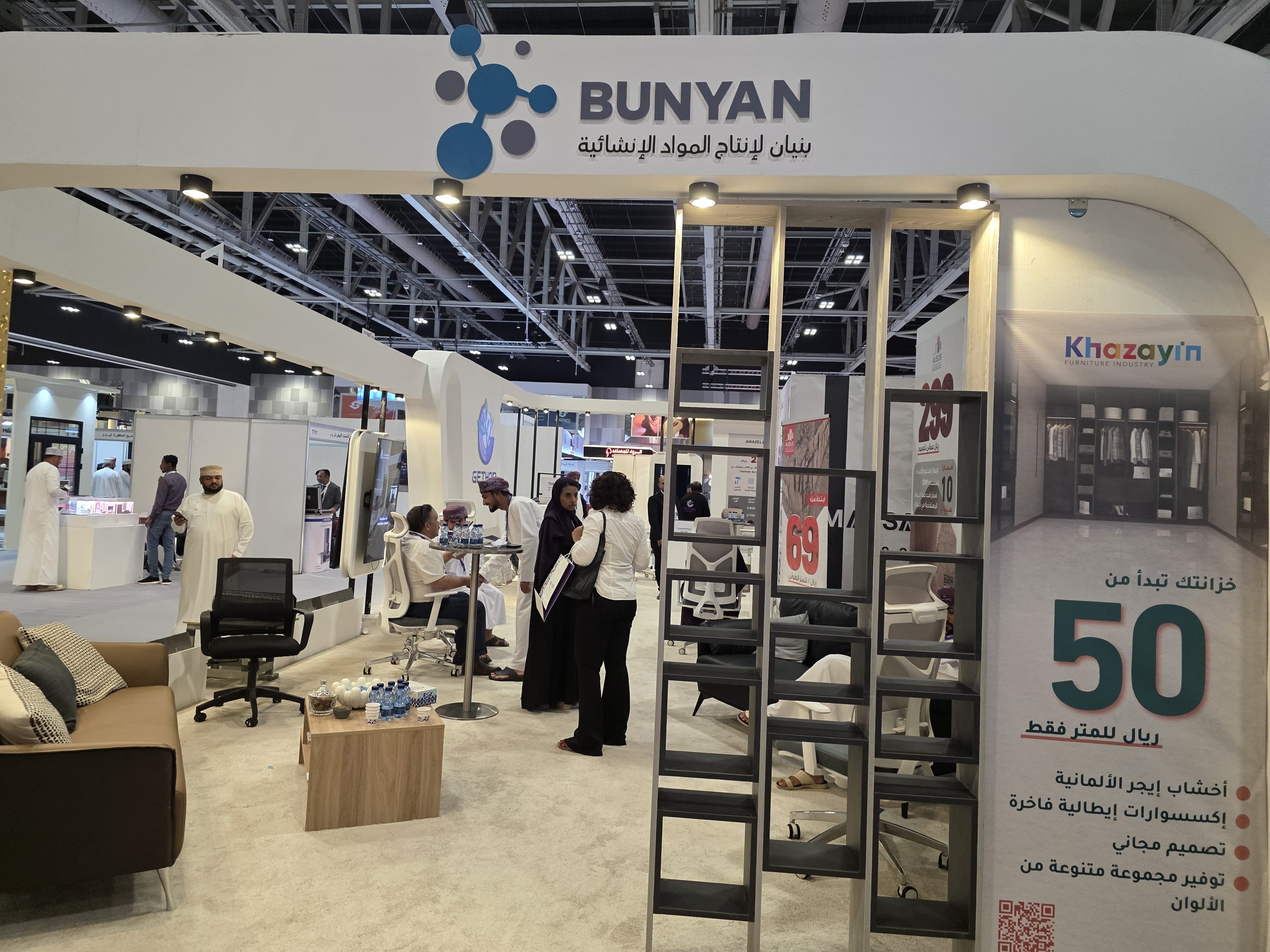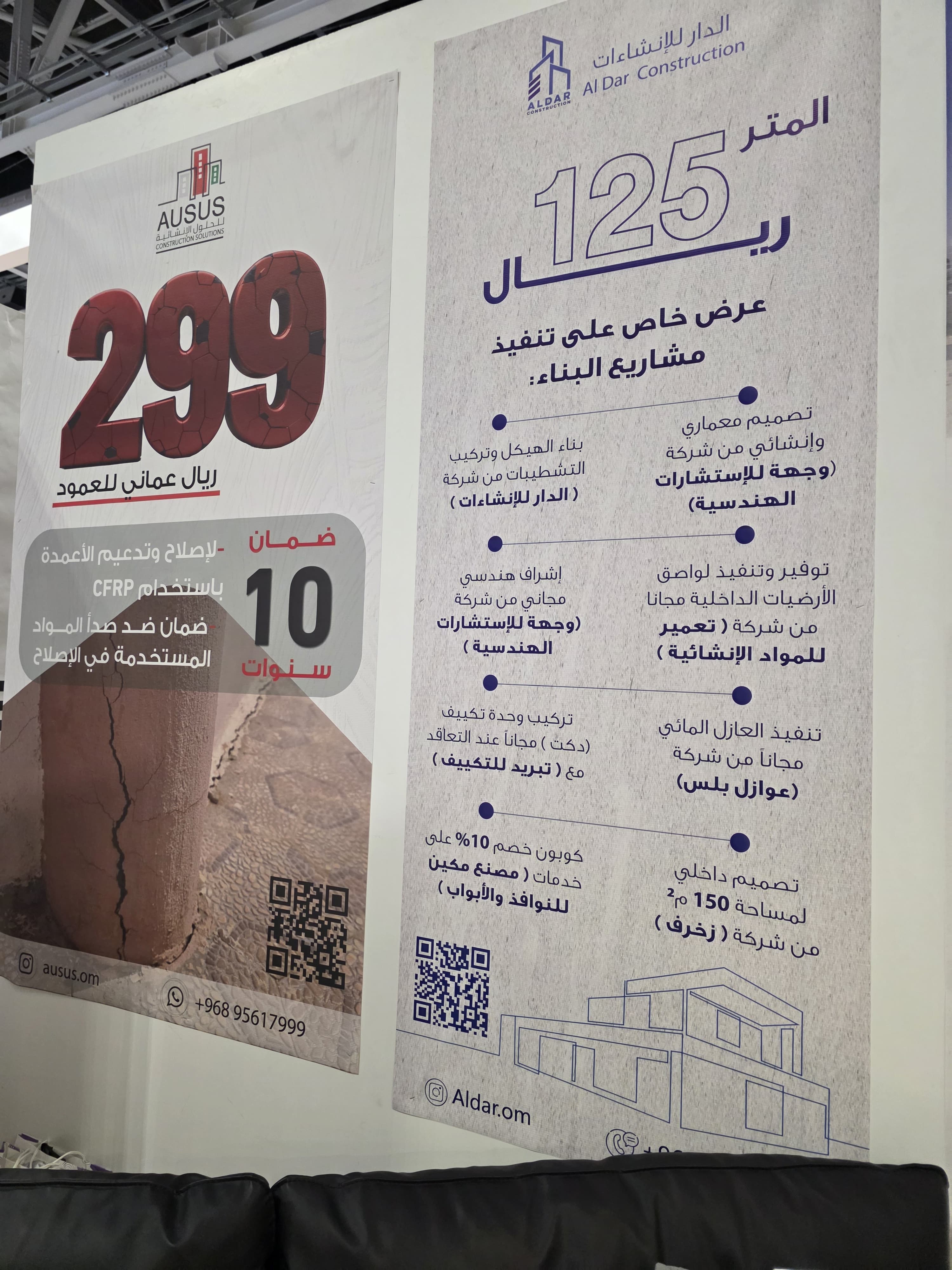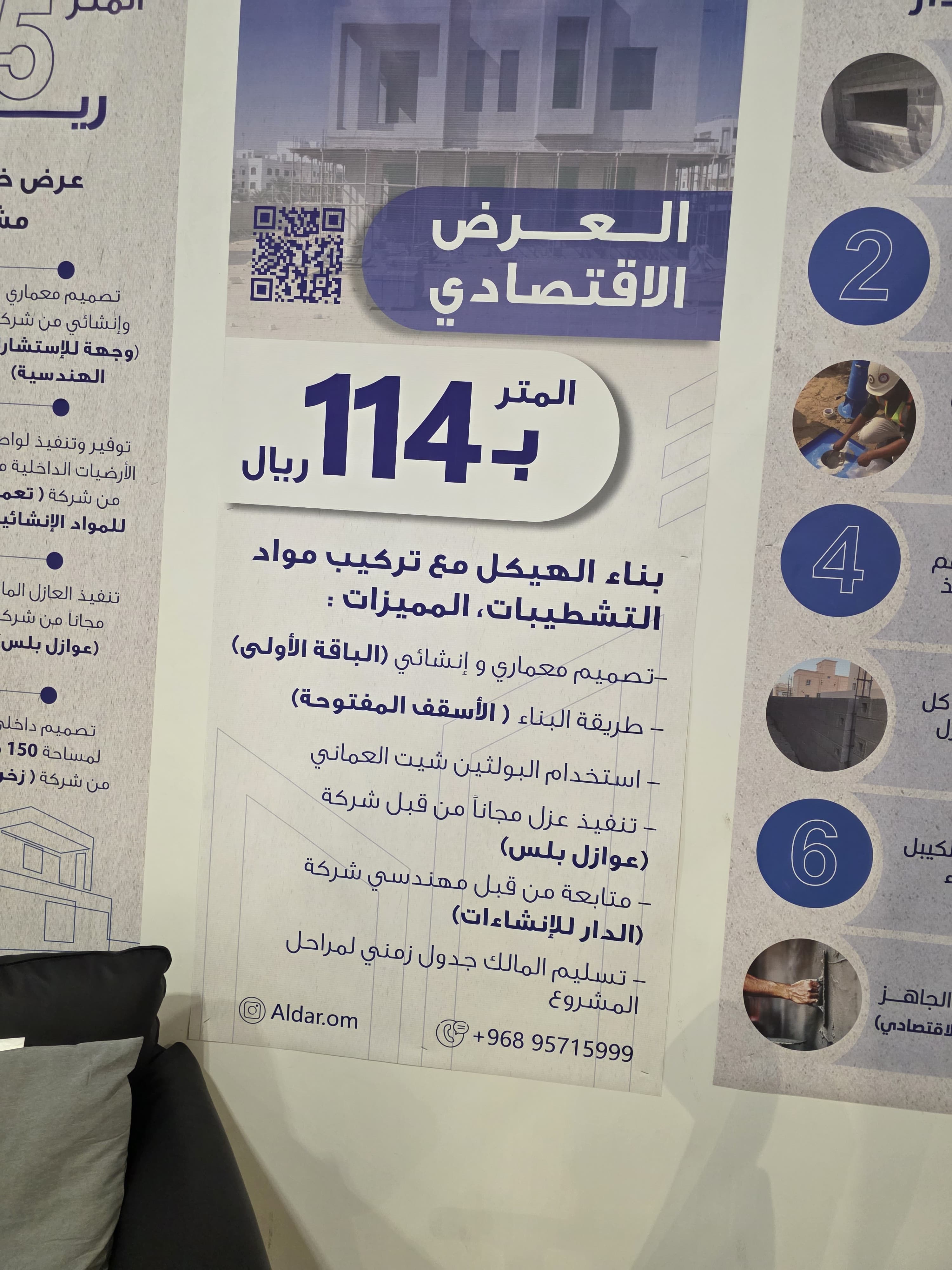 وخلال المعرض، قدمت شركة الدار للإنشاءات عروضًا مميزة للبناء، من أبرزها عرض 125 ريالًا عمانيًا للمتر المربع الذي يشمل الإشراف الهندسي من شركة وجهة، وتنفيذ الهيكل والتشطيبات الأساسية بواسطة الدار، مع توريد مواد السباكة والكهرباء والبلستر الجاهز، بينما يقتصر عرض 114 ريالًا عمانيًا للمتر المربع على التنفيذ دون توفير المواد، حيث يتولى العميل شراءها، وتتكفل الشركة بأعمال التركيب.