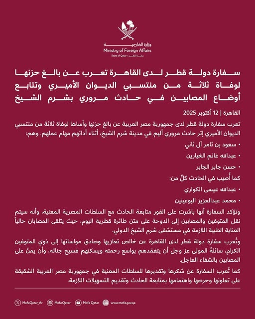 أعربت سفارة قطر عن بالغ حزنها وأسفها لوفاة ثلاثة من منتسبي الديوان الأميرى إثر حادث مروري أليم بمدينة شرم الشيخ، أثناء أدائهم مهام عملهم، متوجهة بالشكر إلى السلطات المصرية على تعاونها واهتمامها بمتابعة حادث شرم الشيخ المرورى، وتقديم التسهيلات اللازمة.