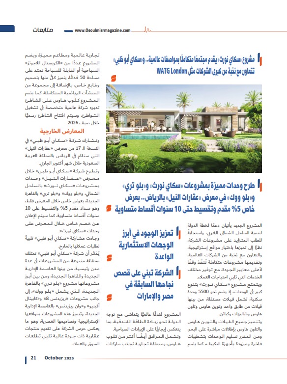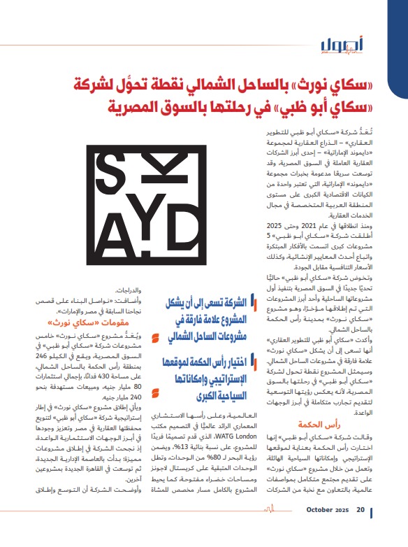 «سكاي نورث» بالساحل الشمالي نقطة تحوُّل لشركة «سكاي أبو ظبي» في رحلتها بالسوق المصرية
