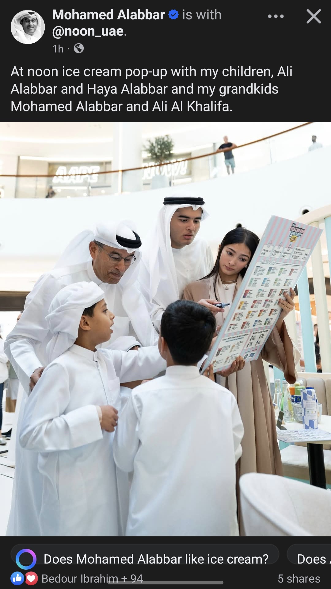 نشر محمد العبار عبر صفحته الشخصية علي وسائل التواصل الاجتماعي انه يتناول ايس كريم نون مع أطفاله علي العبار، و هيا العبار وأحفاده محمد العبار و علي الخليفة.